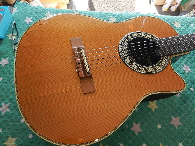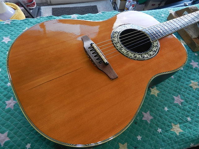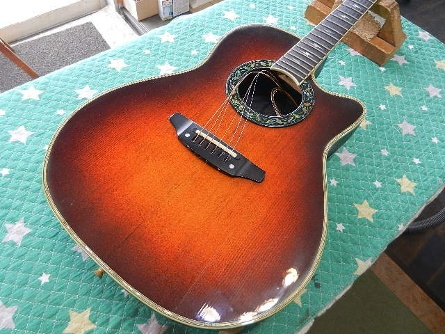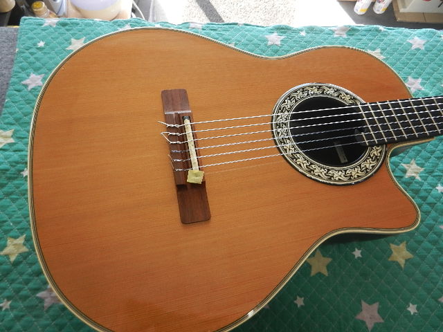 ◆OVATION 1617 ギターオーナー様は、Hat様です 知人に預けていたのですが、音の雰囲気が変わったので 元に戻せ無いかとお持ち頂きました ◆画像から確認して行きます●オベーションの比較的初期のモデルです 試奏しますとオベーションの構造上仕方が無い事かも知れませんが、 アコギらしさが全く感じられず、Hat様の最も苦手な音質と直感しました。●ディープパン・ボディですから、音質を変えれば良くなる可能性が有ります◆リペア開始して行きます●柔らかい音質をボディに伝えるために、エゾ松材をスペーサーに交換しますと チューニングが済む前にOKサインを出して良いと感じましたので、 このままセッティングをします●1フレットのクリアランスに注意しながらロッドを調整します●6E/12Fを2.25mmにセットします●1E/12Fは1.70まで下がってますが演奏上問題は有りませんのでOKです●ダダリオに交換しますと交換した直後にも拘わらず、アコギらしさを感じる音質に変化しました ●リペアの完了です🌻K2ギターファクトリー 千葉県八街市 八街 に-67-3 代表 加藤 和久 ☏ O8O-5376-O998 ⁂お車6台分の駐車場をご用意しております