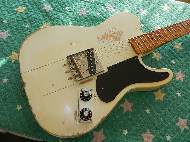 ◆Telecaster NO BRAND Esquire "Snakehead" ギターオーナー様は、レアギターハンターのYosi様です パーツ交換と、ネックの再塗装のご依頼です◆画像から確認して行きます●カスタムショップで限られた台数だけ製作されたモデルのコピーです モデル名をお聞きしましたが、失念してしまい名前が判りません●L3R6のペグレイアウトで製作されてます●ネックの塗装レリック仕上げに満足出来ないとの事で、再塗装して行きます◆リペア開始して行きます●入手可能なマイナスネジに交換します 使用するネジはネックジョイントの4本と、ブリッジ固定の4本だけでした●ご用意頂いたピックアップ固定ネジでは、スカスカで締める事が出来ません このUS Fenderはミリスケールが使われてました●ブリッジ駒はネジが太くて入りませんでした。 ご用意頂いたネジはブリッジ駒用で無いかも知れません●画像右がピックアップ固定ネジで、右側のオリジナルネジと比較すると太さが違ってます 画像左はブリッジ駒ネジで太さもネジピッチも違う事が判ると思います◆ネックを外して指板以外のペイントは一旦落とします●サンプル画像を見ながら弾き込んだ形跡を付けて行きます●画像の一番下を参考にしてます●ヘッドの表は綺麗なクリアで仕上げるオーダーです ヘッドがクリアで指板が○○レリックですと、落差が有り過ぎますので ヘッド裏と同じアーバンゴールドを吹き付けた方がバランスが取れると思います ラッカー仕上げなので、ブラッキー指板に直ぐになりますので、天然のレリックに なります●フレットボードのマスキングテープを剥がして、レリック加工されていた塗装を落として アーバンゴールドで着色します●ヘッドもフェンダーが多用するアーバンゴールドカラーで着色します ●ネック裏も更に着色して行きます◆クリアを吹く前ですので艶が出てません。クリアを吹くと艶が出て良い感じに仕上がって行きます◆クリアを吹いて行きます●着色した直後なので経年変化が有りませが、直ぐに馴染んで紫外線で変化して行きます●フレットワイヤーに直接クリアを吹きますと、後処理が大変なのでローソクの蝋を 塗ってからクリアを吹いて行きます●ヘッド裏です●ネック裏も指定の画像とほぼ同じ様に弾き込んだ感じを出して有ります まだクリアは5回しか吹いてませんので、更に5回吹いて艶を出して行きます●クリアが吹きが完了しましたので、フレットワイヤーのクリアラッカーを取除きます 予め蝋を塗って有りますので、比較的簡単に取除く事が出来ますが、塗られたクリアが パキパキ飛びますので、防御用メガネ使用は必須です●フレットボードの仕上がりです●ネック裏の仕上がりです◆仕上げのクリアが済みましたので、ハードウェアーを組込んで行きます●クリアを吹いたぶん狭くなったペグ穴を、リマーで広げてからブッシュをセットします●ペグをセットします●ネックはマイナスネジで取付けて有ります◆セッティングを決めて行きます●6E/12Fは2.00mmにセットして有ります●1E/12Fは1.60mmにセットして有ります●1Eを1.80mmまで上げますとフレットの擦り合わせは不要になりますが 1.80mmまで上げると弾き難いので、必要最小限で摺り合わせます●工房のオリジナル治具で擦り合わせます●更に1弦をチョーキングした時に接触するフレットも擦り合わせて フレットクラウンを修復します●フレットクラウンの修復も完了して、フレットボードの仕上がりです●ヘッドストックの仕上がりです●ヘッド裏の仕上がりです●ネックの仕上がりです●マイナスネジで取付けて有ります●リペアの完了です ニトロセルロース・ラッカーを使って仕上げて有ります。 お渡しはラッカーが完全硬化する日曜日以降でお願い致します🌻K2ギターファクトリー 千葉県八街市 八街 に-67-3 代表 加藤 和久 ☏ O8O-5376-O998 ⁂お車6台分の駐車場をご用意しております