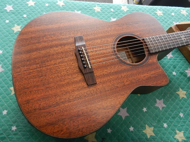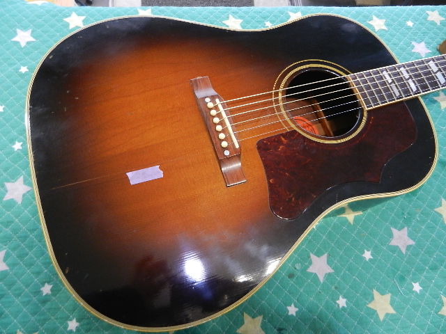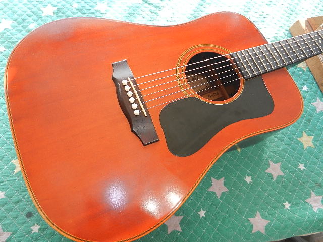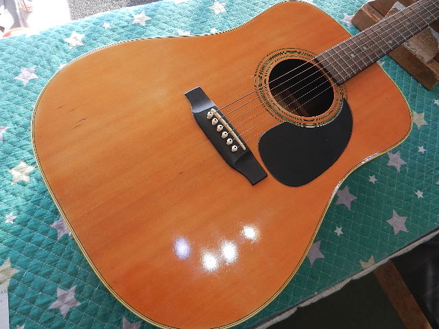 ◆GUILD G-75 セッティング ギターオーナー様は、三重県在住のTaka様です。 Gibson L-1に続いてのご依頼です 輸送中のトラブルも無く無事到着しております◆Taka様からメールで頂いたご依頼の内容を確認のためアップします ①ネック周りの点検 ②サドル交換 ➡交換不要でした ③ナット交換 ➡交換不要でした ④フレット擦り合わせ【音詰まりが有れば】➡必要有りませんでした ⑤エンドピンジャック12mm径 ⑥ピックガードによってトップ変形有り、クラックが有れば補修 ➡ピックガードを一旦外してトップ板修正します ➡問題有りませんでした ⑦クリーニング ⑧他に有ればご相談の上で決定します◆画像から確認して行きます●極わずかな期間だけ製作されたモデルで、ネット検索しても殆ど情報が取れません 若干小振りなドレッドノートタイプで、塗装のダメージからラッカー仕上げで間違い無いです●ロッドカバーは収まりが良く見える画像の向きは、実は逆に付いてますのでGUILD流の 正しい向きに付替えます●ナチュラル仕様のモデルですが、色の焼け方が芸術的です●ナット交換のご希望を頂いてますが、ナット両端のクリアを除去して、 全体をマイクロファインで磨けば、全体の雰囲気にマッチしますので交換する必要は有りません●サドルは交換した方が良いと判断しました●ピックガードを精査してましたら、ソリッドトップでは無い事が判明しました ピックガードの周囲はラッカーのウエザーチェックでトップ材のクラックはネックの付根の 際だけの様です●エンドピンジャック用に12.0mm径の穴を開けておきます◆点検している流れてリペアに入って行きます●1フレットのクリアランスと、加工精度も良好ですのでナットの交換は必要有りません●6E/12Fは到着時点で3.25mm有りました●1E/12Fは2.80mm有ります◆ミラーを差し込んでピックガード周囲のボディを内部から確認します●慎重に確認しましたところ、トップ材にクラックは有りませんでした●この位置も同様でクラックは有りません●ピックガードと指板の境目に僅かに、極浅いクラックが有りますのでニカワを流し込んで 補強します👇内部からの補強は出来ません●クラックの真下にはネックヒールの構造材が有りますのでパッチを貼る事は出来ません●クラックに入り込んだワックス?らしい物を取除いてニカワを流し込んでおきます●エボニー指板の宿命とも言えるクラックが入ってます 進行しないように手を入れる必要が有ります●フレットボードのクラックは、瞬間接着剤に指板材のパウダーを混ぜて摺り込む様に クラックを塞ぎます●硬化したら木目に対して平行にサンディングします●エボニーのフレットボード用のステインで着色します ステインが乾いたら蜜蝋ワックスで仕上げます●ジャック用の12mm径の穴を開けて有ります◆ピックガード周りのトップのトラブルが有りませんでしたので、セッティングして 行きます。当初の見込みより工数が掛からないと思われます。◆弦を張り戻してセッティングして行きます●ロッドカバーの跡がハッキリ付いてますので、その跡が目立たない様に 付けた方が良いかも知れません●1フレットのクリアランスを確認しながらロッド調整をします 6E/12Fで3.25mmから2.30mmまで下がりました●1E/12Fも2.80mmから1.80mmまで下がりました ネックの安定を待ってから、音詰まりするポジションが無いか確認します◆ネックの安定とボディ全体のバフを掛ければ、お渡し出来る見込みとなりました。 当初の見込みよりも大幅に工数が減ってます◆ボディ全体にバフを掛けて行きます ●ペグを外してバフ掛けします●フレットボードのクラック跡は良く見ても判らないレベルです●ネック裏の仕上がりです●伸ばしたワックスのスポンジが黒茶の汚れが付きましたので、タバコが原因と思われます ●黄色のスポンジが秒でこの状態でした●一皮むけた様に仕上がりました。 煙草を吸わない方ですと、バフ掛け後でも反応されるかも知れません。◆セッティングを決めて行きます●ナットは交換しないでマイクロファインで磨て仕上げて有ります 1フレットのクリアランスOKです●サドルも牛骨でしたので交換しないでマイクロファインで磨いて仕上げて有ります●6E/12Fは2.50mmに仕上げて有ります●1E/12Fは2.00mmに仕上げて有ります●フレットボードの仕上がりです●バックの仕上がりも良い感じです●迫力を感じる飴色のトップは思わず目を見張ってしまいます◆ロッド調整した直後ですので、発送まで2日程度の猶予を設けて、セッティングが 変わらない事を確認してからお送り致します。🌻K2ギターファクトリー 千葉県八街市 八街 に-67-3 代表 加藤 和久 ☏ O8O-5376-O998 ⁂お車6台分の駐車場をご用意しております