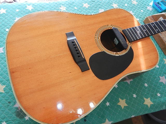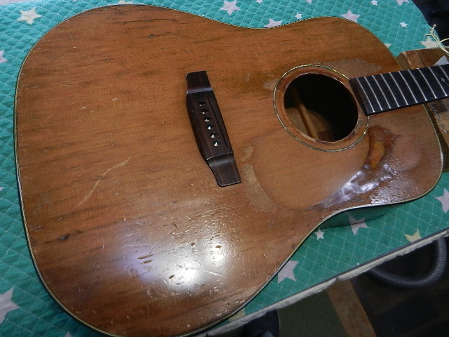 ◆Martin D-28 ギターオーナー様は、Sato 様です。 きよたく様からのご紹介でリペアのご依頼を頂きました。◆画像から確認して行きます●飴色ボディカラーと良い感じに弾き込まれた良く鳴ってくれる28です●ブリッジが剥がれてますが、剥がれに気が付きましたら速攻でリペアに出して下さい 放置しておきますと良い事は一切有りません●ブックマッチの位置でトップにクラックが入ってますが、ソリッドトップの税金の 様な物です。正しくリペアすれば音質低下に繋がる事は有りません◆タイトボンドが硬化するためのロスタイムが必要なのでリペアに入ります●ピックアップを外しましたが、固定用のワッシャーと菊ワッシャが足りませんので 不足分のパーツを付けてセットします●ピックアップを外してノックテストを改めしますと、バック側4番の右が剥離してました●剥離箇所にタイトボンドを流し込んでジャッキで固定します●同時進行が可能なブリッジの接着固定をします 剥離箇所にタイトボンドを圧入して専用クランプで固定します●ボディクランプを掛けて内部のブレーシングの密着度を高めます 実際に弦を張れるまでには、3日以上待つ必要が有ります●昨日固定したクランプを外してノックテストをしますと、剥離している反響音が 返ってきますので確認すると、バック3番の左が剥離してました●バック3番の左の剥離箇所にタイトボンドを圧入してクランプで固定します●続けてトップのブックマッチのクラックを接着固定して行きます パッチはマホガニー材を使います●ネックヒールのカバーが欠損してる事に気が付きました。 ご了解を頂いてエボニー材でネックヒールを削り出し取付けます●角度の関係でクランプ固定出来ませんので、接着力が強力なマスキングテープで固定します◆セッティングを決めて行きます●ロッドで出来る限り調整します●良い感じにネックが調整出来ました●サドルの出が少ないのですが、6E/12Fで2.40mmまで下げる事が出来ました●1E/12Fは1.90mmまで下げる事が出来ました●削り出したネックヒールの固定が済みました●クラッシク楽器用のエボニーステインで着色後にアマニオイルを塗って浸透させてから 乾拭きして仕上げます。 オリジナルと違ってエボニーの質感が有り良い感じに仕上がります●ネックヒールカバーの仕上がりです●スカイソニックT-902を付け戻します●トップセンタークラックの仕上がりです●接着固定したブリッジの仕上がりです●リペアの完了です 次回のライブの間に合いました🌻K2ギターファクトリー 千葉県八街市 八街 に-67-3 代表 加藤 和久 ☏ O8O-5376-O998 ⁂お車6台分の駐車場をご用意しております