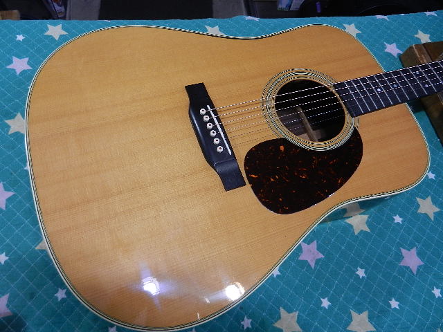 ◆Martin D-28 バインディング剥がれ ギターオーナー様は、Toku様です ブログをご覧頂いた事がご縁で来店して頂きました。◆画像から確認して行きます●ネットで入手されたそうですが実に良く鳴る28です トップ材も勿論ですが正に当たりのギターです●マーチン特有と言うか、バインディングの剥がれが発生してます バインディング自体が縮んで発生するので、バインディングの材質を変えたらと思います●バックの左右同時に出てるのは珍しいです。 過去の記憶ですと左に出たら次は右と時間差で発生する事が殆どです●張り合わせの部分で既に隙間が出来てます。 ボディのクビレの部分まで外して接着固定して、色を合わせたバインディングで隙間を埋めます ●お話しの中で、フィンガーピッキングの演奏スタイルと言う事で、弦高が高いと感じましたので ロッド調整して6E/12Fを2.25mmまで下げましたら、とても気に入って頂いきまして 工房標準のセッティング調整しておきます。 同時にお預かりしましたGibson J-45も同じセッティングにします 一度2.25mmの世界を知りますと戻る事が出来ない様です◆リペア開始して行きます●これ以上剥がれない位置をマスキングテープで固定してタイトボンドで接着します●左右のバインディングを接着固定します はみ出したタイトボンドは、固く絞ったウエスで完全に拭き取れますので気にしないで マスキングテープで固定します●縮んで空いた隙間はバインディング材で埋めます●反対側も同じ様にマスキングテープで固定します●1日経過しましたのでマスキングテープを剥がし接着面を確認します●反対側もOKです●隙間の仕上がりです◆バックの接着が済んでトップ側を見ますと様子が変です●トップの左側も外れてます。バック側よりも綺麗に剥がれてます●トップのエンド側はボディとネックに挟まれて固定されてますので バインディングの先端を抜き取ってから接着固定する必要が有ります。 この時にパワー任せで抜き取ろうとすると、バインディングが折れますので 公開出来ませんが、正しい手順で抜き取る必要が有ります●バインディング全体が綺麗に収まる事を先に確認してから、タイトボンドで接着固定します●正しく接着されている事を確認しました◆セッティングを決めて行きます●バインディングを接着固定する前に弦高調整は済んでましたので 6E/12Fは2.25mmにセットされてます●1E/12Fも1.75mmでセットされてます●セッティングした弦高で音出しテストをしますと、ローポジションで音が微妙に 詰まりますので、フレットの段差を確認します👇 ●ロッドを緩め弦高を上げてかわす方法も有りますが、僅かに段差が有りますので 擦り合わせて調整します●ピンポイントで擦り合わせが出来る治具を使います●弦を緩めてフレットクラウンを修復してから、フレットボード全体をクリーニング して有ります●リペアの完了です🌻K2ギターファクトリー 千葉県八街市 八街 に-67-3 代表 加藤 和久 ☏ O8O-5376-O998 ⁂お車6台分の駐車場をご用意しております