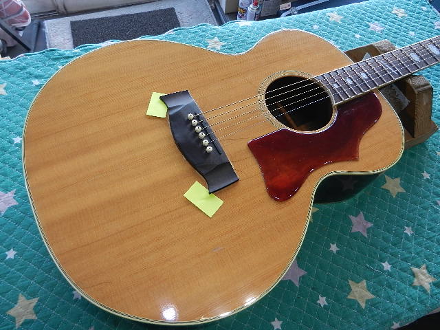 ◆Gibson J-200タイプ ギターオーナー様は、Hat様です 全体のチェックとセッテングのご依頼です◆画像から確認して行きます●個人ビルダーの方の作品と言う事ですが、製作者様の情報が判りません Gibson J-200 を1回り小振りにしたシェイプです ブリッジの両角が剥離してました●内部を確認しても製作者様のサインも有りませんでした●2mm厚のピックガードが使われてます●ペグはGibson純正品が使われてます●バックの仕上げの感じからラッカー仕上げです◆リペア開始して行きます●剥離しているブリッジの接着から始めます●僅かな隙間にタイトボンドを流し込みクランプ固定します●安価な弦を使ってセッテングして行きます。 1フレットが高いので0.5mmのスペーサーをセットします●ロッドで調整出来る限界は、6E/12Fで2.50mmですが試奏して見ると、 この高で有る事を感じません●1E/12Fは2.00mmですので、世界標準の弦高と言う事になります●試奏して感じる事は出音の輪郭がはっきりしなくて、Hat様が好まない音で有る事は 間違い無いです。 エボニーのサドルとの相性が良くないのと、ブリッジから出ているサドルの高さが、 最も高い3E&4D弦の中央で1.50mmしか有りません。 この影響でサドルの上面が平らのままで、弦が乗っている事も出音に関係していると推測してます。 音質を良くする方法として、サドルの出を高くするためにブリッジのトップを削り、 牛骨オイル漬けのサドルに交換する方法を選択したいと思います◆弦を外したサドルの状態です●ブリッジの上面から1.5mm弱しか出てないので弦接点が平面になってます●ボディからブリッジの高さは6.0mm有りますので、ブリッジの上面を1.0mm削って サドルの出を確保します●弦との接点が水平では弦とサドルの接点が長すぎるため、輪郭のはっきりしない出音になります●サドル溝の深さが3.0mm有りますので、トップを1.0mm削っても問題有りません●サドルの溝の深さを確認しながらブリッジトップを削ります●サドルの出が2.50mmになっている事を確認します●オイル漬けのサドルを削り出す前にフレットボードのRを確認します●既存のサドルは400Rになってません。ギター製作者様がこの様な事をするとは 考えられませんので、オーダーされたオーナー様が弦高を下げるために削ったと 思われます●1E&6Eの高さを基準にしてオイル漬けのサドルを削り出します 弦接点の加工は弦高を確認してからと言う事になります◆セッティングを決めて行きます●1フレットにスペーサーをセットします●6E/12Fが2.50mmなのでサドルを仕上げる時に微調整します●1E/12Fも2.0mm有りますので微調整が必要です●ローポジションで音詰まりする箇所が有りますので擦り合わせをします●擦り合わせ後にフレットクラウンを修復します●ブリッジにオイルを塗って仕上げます●全てのフレットを磨いてフレットボードにオイルを塗ります●1フレットのクリアランスを揃えます●6E/12Fは2.35mmが限界でした●1E/12Fは1.75mmにセットしました●フレットボードの仕上がりです●リペアの完了です🌻K2ギターファクトリー 千葉県八街市 八街 に-67-3 代表 加藤 和久 ☏ O8O-5376-O998 ⁂お車6台分の駐車場をご用意しております