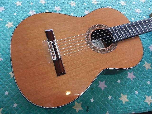 ◆KODAIRA AST-80 ギターオーナー様はY.M様です。 リペアさせて頂いた同じクラッシックギター教室の、Nakayama様からのご紹介で お越し頂きました。◆画像から確認して行きます●6年間弾き込まれたギターですが、4Dの解放弦がビビるので最近は出番が減っているそうです◆リペア開始して行きます●フレット全体のクリアランスが0.18mmしか有りません。この高さですと強めに アタックしますと殆どの解放弦が接触してしまう高さです●ナットを交換すれば元の様に活躍してくれますのでご安心下さい●ナット交換後はハナバッハに交換します●粗削りした水牛骨のオイル漬けのナットを仮置きします●オイル漬けのナットはギターの風景とマッチして、見た目も音質も良くなります●弦溝をナットファイルで削ってフレットのクリアランスを、セッティングを考慮して 0.5mmプラスαで仮に揃えます●サドルの上面を削って弦の溝の深さを調整します●ナットのシェイプを整えて、仕上げにマイクロファインで磨きますと艶が出て来ます●弦高をセットするためサドルを確認しますと、6弦側に隙間が有り浮いてます●サドルを外して確認しますと、弦高を上げるためのスペーサーが入ってました●何処かで見た様な?と思ったら【爪楊枝】でした。一瞬、力が抜けました。 取り合えず爪楊枝を外して弦高をチェックしますが、スペーサーが必要でしたら エゾ松材で作ります●6弦10フレットの高さは2.50mmです。少し低いのですが試奏して音詰まりが 出無ければOKです●1弦10フレットは2.25mmです●1フレットのクリアランスを微調整します◆ボディ全体にワックスを掛けるため、ネックに貼って有ったテープはワックス掛けの 障害になりますので外しました。代わりにポジションマークに使うシールをサイドに 貼りました。●超鏡面ワックスで磨いて有ります●フレットワイヤー&フレットボードも磨いて有ります●ポジション移動が激しいクラッシクギターのネックは、滑りが良いと演奏も楽になります●新しい弦に交換してリペアの完了です🌻10日のご来店を心からお待ちしております🌻K2ギターファクトリー 千葉県八街市 八街 に-67-3 代表 加藤 和久 ☏ O8O-5376-O998 ⁂お車6台分の駐車場をご用意しております