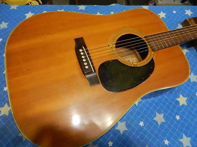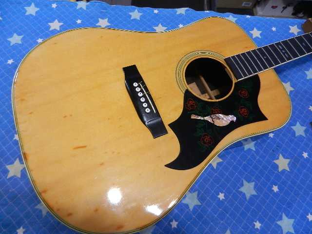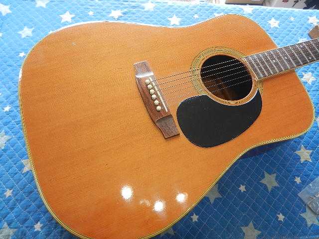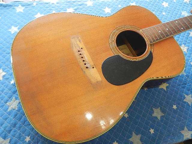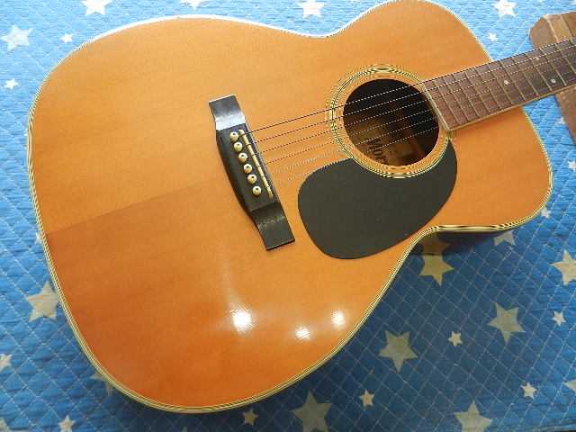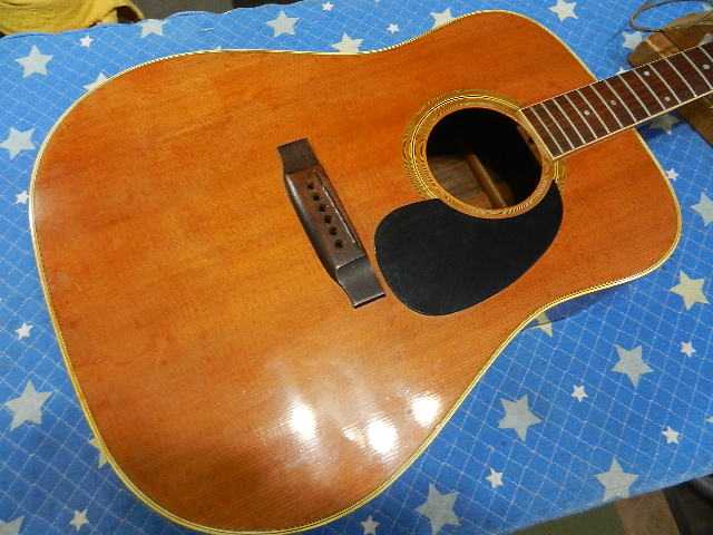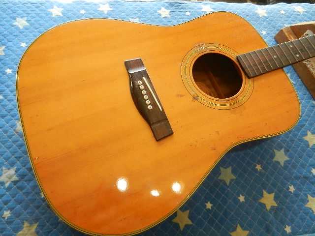 ◆YAMAHA FG-151 青春のギターリペア ギターオーナー様は、Seo様です 中学生の時にご両親からプレゼントされたギターで、正に青春のギターです。 社会人になって他のギターを入手されて、手放して来ましたが何故かこのギターだけは 手元にずっと置いていたそうです。 数十年の時を経てコンディションが宜しく無いので、再生して欲しいとお持ち下さいました。 託して頂いたFG-151のギター人生の中で、最高のコンディションにしてお返し致します。◆画像から確認して行きます●ボディ全体に手を入れる事で見違えるほどビンテージ感が出ます●ヘッドネームを消して云々は、昔のギターキッズが経験していると思います●クリアが吹かれたブリッジのキズはギターの見た目を損いますので、弦高を下げる関係で ブリッジ全体のクリアを除去します。 サドルはオイル漬けに交換します●純正ペグから交換されているカバードタイプのペグも交換します●ピックガードはマーチンタイプを貼り付けます◆リペア開始します●ペグが使え無いとセッティングに入れませんので、先にペグを交換しておきます●アリア製のグロバータイプのペグをセットします。 幸いな事にあれだけ有る埋木跡が殆ど隠れて見えません●ギヤ比20対1のペグです●ブリッジのクリアと傷をサンディンして取除きますと見た目が変わります●ボディ全体にバフを掛けますと、ビンテージ感が強調されて威風堂々としてます●予定の弦高にセット出来る様に、削る前のブリッジの高さを測定しておきます●ブリッジを削って既存のサドルをセットします●6E/12Fで3.25mm有ります●1E/12Fは2.50mmです●予定の弦高になるように捨てサドルを削ってセットします●1フレットに0.5mmのスペーサーをセットします●弦を張り戻して予定通りにの弦高になっているか確認します●6E/12Fは2.25mmで予定通りです●1E/12Fは1.80mmで誤差の範囲でOKです●ブリッジ&サドルの高さが決まりましたので、全周削ったブリッジを蜜蝋ワックスで仕上げます●捨てサドルと同じサイズにオイル漬け牛骨を削り出してセットします●切出したピックガードを貼り付けます●セッティング用の弦からダダリオのエキストラライトゲージに交換してセッティングを 確認します●6E/12Fは2.25mmにセットして有ります●1E/12Fは1.75mmにセットして有ります●リペアの完了です お使いになる弦は、エキストラライトゲージ【010~】限定でので、これより太い弦は 絶対に使わない様にしてください。🌻K2ギターファクトリー 千葉県八街市 八街 に 67-3 代表 加藤 和久 ☏ O8O-5376-O998 ⁂お車6台分の駐車場をご用意しております