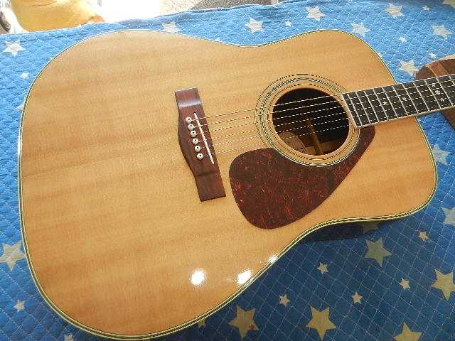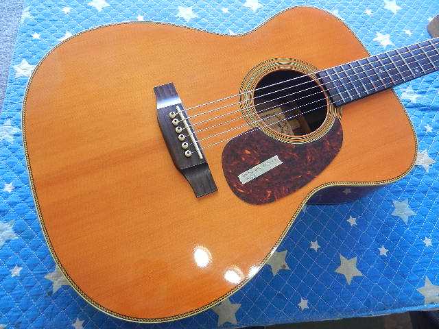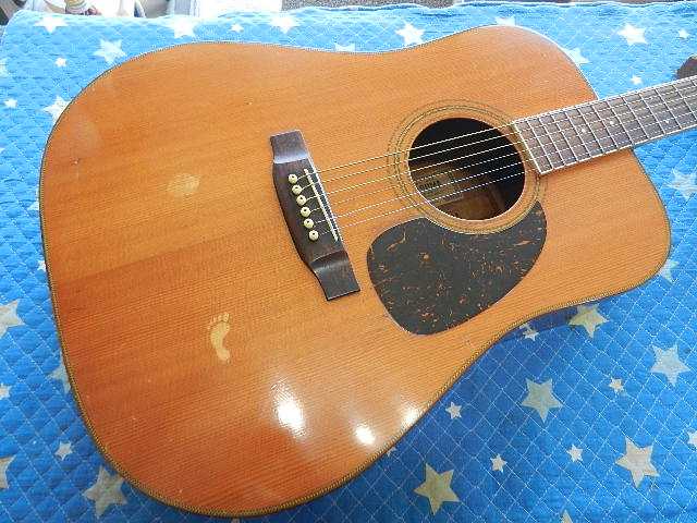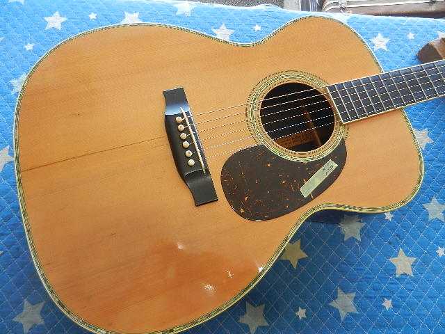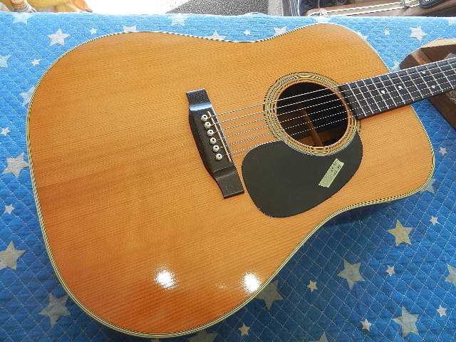 ◆MARTIN D-28 セッティング ギターオーナー様は、T.Sawamura様です。 D-28を含めて4台の愛機をお預かりしました◆画像から確認して行きます●飴色に変化して風格を感じさせる佇まいです◆リペア前のコンディションを確認します●6E/12Fで2.75mmなので、弦高は極端に高い訳では無いのですが弾き難い印象です●1E/12Fで2.25mmです 工房の標準的設定より0.5mm高いのですが、測定値よりも弾き難く感じます●原因は6フレットを頂点に0.3mmの順ゾリです●ネック内にロッドは仕込まれてますが、ロッドの調整ナットが有りません。 この程度の順ゾリで有れば、ロッド調整出来れば簡単に解決する問題です◆リペア開始して行きます●ロッド調整が出来ませんので、弦を完全に緩めてネックの自然治癒力に期待して見ます。 要するに弦を緩めて数日様子を見ると言う事です●この順ゾリに対応出来るほどサドルの出に余裕が有りません●3日間様子を見て来ましたが、自然治癒力がこれ以上期待出来ないのでネックアイロンで矯正する 選択をしました。 ●アイロンを外して固定治具に交換する際に、ネックの状態を確認すると順ゾリが修正出来て 1フレットが0.5mmの逆ゾリになりましたので、アイロンが想定通りの効果が出ました●固定治具に交換して数日様子を見ます⇩●ネックアイロンを掛けた直後とネックの状態に変化が有りませんので、弦を張り戻して セッティングします。 アイロンを掛ける前には0.30mm有った順ゾリが0.15mmまで減りました。 この順ゾリですと弦高が高いと感じません。●1フレットに0.5mmのスペーサーをセットして弦高を確認します●6E/12Fは2.50mmまで下がりました●1E/12Fも2.00mmまで下がりました●サドルを0.5mm削って予定の弦高になるようにします●調整が済んだサドルをセットします●1フレットにスペーサーをセットします●6E/12Fを2.25mmにセットしました●1E/12Fは1.75mmにセットしました●フレットボードの仕上がりです●リペアの完了です🌻K2ギターファクトリー 千葉県八街市 八街 に 67-3 代表 加藤 和久 ☏ O8O-5376-O998 ⁂お車6台分の駐車場をご用意しております
