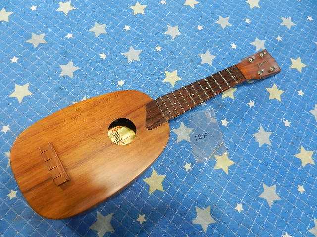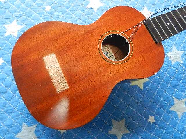 ◆KAMAKA パイナップル型ウクレレ ギターオーナー様は、ピタゴラスイッチ オープニングテーマ/栗コーダーカルテットの 川口様です。 ブログをご覧頂いた事がご縁でお越しくださいました。 ◆画像から確認して行きます●パイナップル型のビンテージKAMAKAです●艶有りゴールドラベルの【Hawaiian Handmede 】です◆リペア前のコンディションを確認します●リペアに慣れていない方が手を入れた様で、木工用ホワイトボンドで接着された痕跡が有ります 外れ掛かっているネックを分離して、接着剤を取除いてから接着固定するか判断してから 取り掛かります。 エポキシ系&瞬間接着剤が使われて無いので良かったです●接着後にフレット溝を埋木してからフレットを打込む事になります●ネックが外れた事でサイド材が引っ張られて浮いてますので、ネックを外してから接着します 接着面を精査しますと、ネックが外れて再接着されてますので、このまま再々接着しても 接着面の強度不足で同じ状態に成る可能性が有りますので、補強方法を検討しないと駄目です●ネックを外します。 ダボ穴径とダボ径が有ってません。ダボを穴径に合わせて交換するか、ダボを1本追加して 取付強度を上げるかの選択になります。 ダボを取除いてボルトオンにする方法が有る事に気が付きました。具体的にはネック側に ボルト受けを埋め込んで、サウンドホールからボルトで固定する工法です。 小さなウクレレのサウンドホールからボルトが締め込め込可能かテストして見ます●ボディ&ネックに残っている接着剤を取除きます●バック材とサイド材の剥離箇所を接着固定します。 固定治具は水道用の塩ビ管をヒートガンで炙って、ボディにおっぺして同じカーブを 描くように加工します。 同じカーブの治具を使うと接着面に圧が平均に掛かります●ネック付根のサイドの接着が済みました●ネックを接着固定して行きます●タイトボンドを入れる前に、ネックセット角度を確認しておきます●クランプを掛けて固定を待ちます●1弦と4弦の位置が正し位置に有る事を確認しました。 ●前屈みになっていたネックを正しく接着したので、必然的にこの位置に隙間が出来ます 隙間がフレットよりも広いので、マホガニー材で隙間を埋めます●ウクレレのフレットタングの巾はギターよりも狭いと思ってましたが0.5mmなので、 ギター用のフレットソーが使えます●ボディをノックテストしますと、違和感の有る反響音が返って来ますので確認すると ゴールドラベル右下のブレーシングが剥離してました。●ジャッキが掛けられないので、クランプで押さえ込んで接着固定します●ネック外れで欠損していた12フレットを打込んで、フレットワイヤーを磨くため マスキングします●マイクロファインとピカーを使って磨きます●フレットボードの仕上がりです●1G弦と4E弦の位置が正しい位置に来ている事を確認します●弦を張った時の弦高をイメージしておきます●ネック接着面の際の隙間は、マホガニーのパウダーで作ったパテで埋めます●ネック接着面の際の隙間は、マホガニーのパウダーで作ったパテで埋めます●La Bella弦の細目を選択しました●タイトボンドが完全硬化するまで、チューニングを待ちます◆硬化時間を充分に取りましたのでチューニングします●4弦10フレットを2.00mmにセットして有ります●1弦10フレットは1.50mmにセットして有ります●リペアの完了です🌻K2ギターファクトリー 千葉県八街市 八街 に 67-3 代表 加藤 和久 ☏ O8O-5376-O998 ⁂お車6台分の駐車場をご用意しております