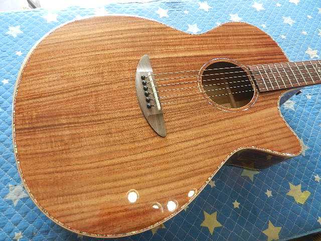 ◆DAVID GOMES ウクレレ ウクレレオーナー様は、TAKEOI様です。 貴重なビンテージ・ウクレレを多数所有されておられます。 今回ご依頼頂いたDAVID GOMESは、ハワイの著名なウクレレビルダーの作品です。 弦高が低いので上げる事と、フレットエッジが指腹に引っ掛るのでエッジの面取りの ご依頼を頂きました。◆画像から確認して行きます●ロングネックとカッタウェータイプのボディで実に弾き易いです●ヘッドのインレイから【TAKEOI】モデルの呼称で良いと思います。 シャラー製のウクレレペグを初めて見ました。◆お好みの弦高はお聞きしただけでは完全に伝わりませんので、テストとして1mmの マホガニー材をスペーサーとしてセットして感覚を確認して頂きました●1mmのスペーサーをセットして試奏して頂きましたら、測った様にピッタリで有る事と サイド&バックと同じ材である事も有って、音質への影響も感じられないので、仮置きから これでOKを頂きました。将来的に弦高を調整する時に簡単に出来るメリットも有ります。●フレットエッジは、金属と木材の性質と、ハワイと日本の気候の違いで発生する事も有りますので 大きな問題では有りませんのでご安心ください。●マスキングテープを貼ってエッジのバリを取除きます。 マスキングテープを見て頂ければ判ると思いますが、1弦側のフレットボード自体が 削られて凹んでいる事も関係している様です●1弦側のエッジのバリ取り後です●4弦側のバリ取り後です●フレット&フレットボードのクリーニングも済ませて有ります●リペアの完了です🌻K2ギターファクトリー 千葉県八街市 八街 に 67-3 代表 加藤 和久 ☏ O8O-5376-O998 ⁂お車6台分の駐車場をご用意しております