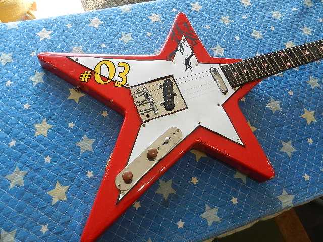 ◆Mars #03 Baby 全体チェック ギターオーナー様は【よしやぎベイベー 一人ちんどん】 の唯様です 一度見たら絶対に忘れないパフォーマンスと言い、自作されたMars#03 Baby(仮称) 個性の塊のようなプレーヤーです◆画像から確認して行きます●ブログにアップする都合で【Mars#03 Baby】と表記してますが、ブログ上のコードネームと 思って下さい。●ミニ4駆のパーツが使われてます◆交換する必要が有るパーツを拾って行きます●6E/1Fがベタ付きになってますので、ナットの交換が必要です●ナットの弦溝は弾いてますと削れて摩耗する消耗品です●4弦がこの位置でバシバシ切れるので、ブリッジ駒の交換が必要です 状態が判り難いのでメッキを取除いて確認します●ピックガードを止めているネジを、低頭の平ネジに交換します 画像左のネジでピックガードを固定する際には、ネジ穴周囲の面取りが必要ですが、 ピックガードが薄いため、画像右の形状のビスに交換します●3Wayセレクターのノブが無いので取付ます●テレキャスの裏通しの穴は、芯ブレしないボール盤を使わないと真っすぐに開ける事は不可能です 例えガイドを使っても、木材にドリルが入って行く間にドリルが逃げて行くからです 独立した6個のガイドでは無く、一列に並んだパーツに交換して、見栄えと弦交換を簡単に 出来る様にします◆点検の流れでリペアを開始します●斜めに入っているネジ穴を埋木してから、平頭のネジと差し替えます●こんな感じに仕上がります●欠品してたノブを取付けます●右がオリジナルの駒で左が最近の駒です。 弦間隔は両者とも10.8mmですが、3個を並べると6mmの差が有ります。 最近の駒のサイズは左側なので、同サイズを探しても見つかりません。 駒を交換すると6弦と1弦が外側に寄って、弦落ちしますので、既存のナットを 修復する方法に変更します●メッキを取除くとドリルで開けた様なキズが有ります これが4D弦がバシバシ切れた原因です 裏表反対にすれば問題無い事に気が付きました。 メッキを落としてレリック加工風にして有ります●レリック加工した駒をセットして、弦が直ぐに切れないか確認します●レリック加工した駒がギターの景色に馴染んでいると思います●ナットを交換します●簡単綺麗に外れました プラスチック製のナットですので音が改善されると思います●数年前に削り出してオイルに漬けたナットを使います●ブッシュプレートが入荷しましたので取付ます●ボール盤を使わなくてもボディの中通しが簡単に出来るパーツです●工夫されて取付されたパーツを外します 弦通しの穴が、均一&一直線に並んでませんので⇩の様にして取付けます●ブッシュプレートとブリッジの間を通すため、ボディの穴の形状は不問です ガタが出ない大きさに開けて押し込んで取付ける様に加工します●弦が簡単に通る事を確認してネジ止めします このパーツは周囲がテーパー加工されてますので、ボディに直接取り付ける方法でOKです●ナットを調整して1フレットのクリアランスを揃えます●音出しテストしますと、2B&3G弦のフレット凹の中で2点で弦が接触して発生する 不協和音が出ますので、フレットを擦り合わせます●1フレットから7フレットと、2弦のハイポジションを擦り合わせます●フレットの面取りをしてからピカールで磨いて仕上げます●セッティング用の弦からダダリオに交換します。 一般的なテレキャスよりも楽に弦が通ります●6E/12Fで2.0mmにセットして有ります●1E/12Fは1.50mmです●リペアの完了です 🌻K2ギターファクトリー 千葉県八街市 八街 に 67-3 代表 加藤 和久 ☏ O8O-5376-O998 ⁂お車6台分の駐車場をご用意しております