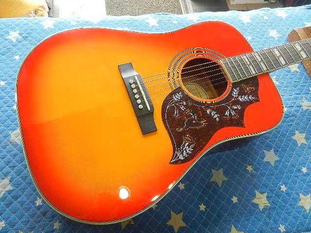 ◆Epiphone Humming Bard PRO セッティング ギターオーナー様は、M.Saitu 様です。 就職して非常に忙しくギターを弾く時間が無いので、身内の方にプレゼントする事になり その前に気持ち良く弾ける様にセッティングして欲しいとお持ち下さいました。 同時にお持ちくださいましたレスポールは簡単に調整出来たのですが、 Hummingはお預かり しないとならないコンディションでした。◆画像から確認して行きます●弦を緩めて保管されて無かったので弦高が上がっている状態です●ピックアップが搭載されてますのでライブで即戦力です◆リペア前のコンディションを確認します●6E/12Fは3.50mm有ります●1E/12Fは3.25mm有ります●1フレットに余裕が有りますのでロッド調整で可能な限り弦高を下げます●順ゾリの最大値が7フレットで0.38mm有ります◆リペアに入る前にロッド調整してネックの状態を確認します●ネックスケールで確認しながらロッドを締め方向に回します●7フレットで0.38mmも有った順ゾリが解消されました●6E/12Fは2.75mmまで下がりましたが、これでは不十分です●1E/12Fも2.60mmまで下がりましたが、まだ不十分です◆リペア開始して行きます●お預かりの際に張って有った弦は、012~のライトゲージで太過ぎますので、 011~のカスタムライトゲージにダウンして有ります 1フレットに0.5mmのスペーサーをセットします●6E/12Fは2.75mm有ります●1E/12Fも2.25mm有ります●予定の弦高になるようにサドルを削って調整します●ピンが普通に取り出しが出来るようにリーマーで調整します●011~のカスタムライトゲージの弦を張ります●1フレットの高さ調整を済ませて有ります●6E/12Fは2.25mmで予定通りです●1E/12Fも1.75mmで予定通りです●リペアの完了です。 とても弾き易いコンディションになってます🌻K2ギターファクトリー 千葉県八街市 八街 に 67-3 代表 加藤 和久 ☏ O8O-5376-O998 ⁂お車6台分の駐車場をご用意しております