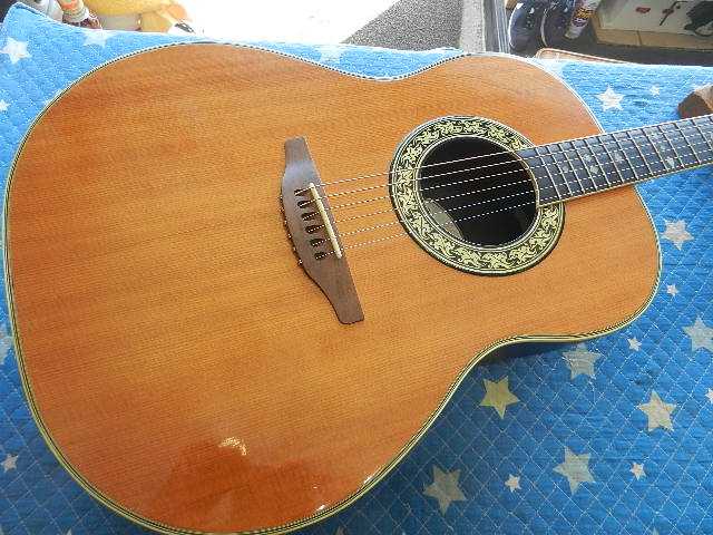 ◆Ovation No.1117-4 USA 再生セッティング ギターオーナー様は、T.Sawamura様です。 Ovationを含めて4台の愛機をお預かりしました◆画像から確認して行きます●パッシブタイプ?のUSA/Ovationです●このエンブレムを久しぶりに見ました●弦高が非常に高く弾く事が困難な原因が、6フレットで最大値0.55mmの順ゾリです●ロッドで調整して効果が有りませんので、ネックアイロンを掛けて矯正して行きます◆リペア開始して行きます●ロッドフリーにしてネックの状態を確認します●6フレットが頂点の順ゾリです●1ピースのネックと違って、センターにハードメイプルが挟んで有るネックは剛性が高いので アイロンの効果が限定的になる可能性が有りますが、アイロンの効果をメインにセッティングします●最初はスペーサーを挟まずにネックを加熱してから、スペーサーをセットして 適正な位置にクランプを掛けます●固定用の治具を外してネックの矯正具合を確認します 0.55mm有った強度の順ゾリが0.15mmまで修正出来ました。 ロッド調整は0.15mmの順ゾリから始まりますので、思った通りのセッティングに出来そうです●ネックアイロンを掛ける前との差は歴然です◆仮のセッティングを確認します●1フレットの調整はラストの工程になります●6E/12Fは2.50mm有ります●1E/12Fは1.75mmですから調整の必要は有りません●サドルを調整する前にフレットボードのRを確認します●予定の弦高になるように250Rでサドルを調整します●調整が済んだサドルをセットします●6E/12Fは2.25mmにセットしました●1E/12Fは1.75mmです●12フレットのセッティングが済みましたので、1フレットのクリアランスを揃えます●フレットボードの仕上がりです●リペアの完了です🌻K2ギターファクトリー 千葉県八街市 八街 に 67-3 代表 加藤 和久 ☏ O8O-5376-O998 ⁂お車6台分の駐車場をご用意しております