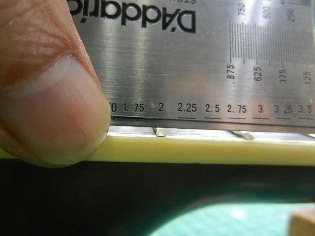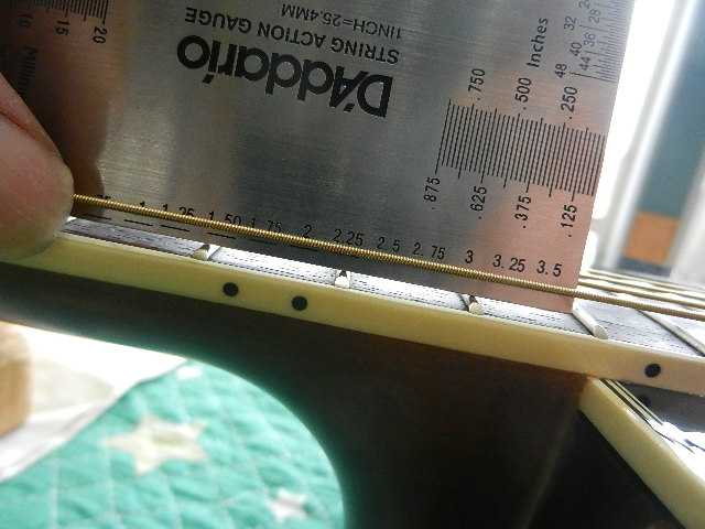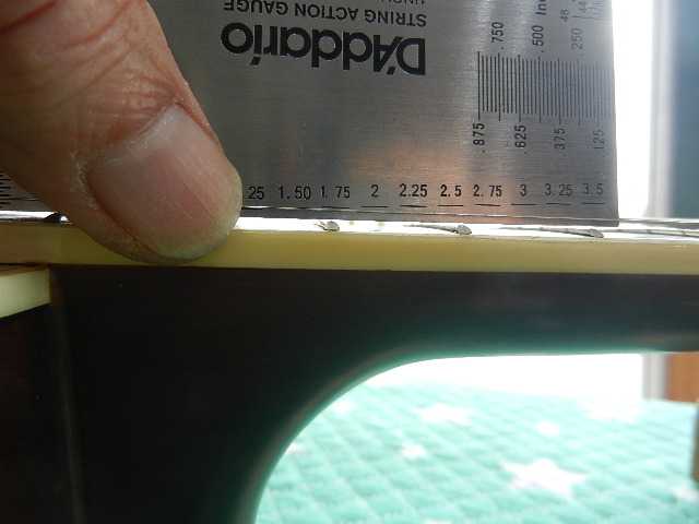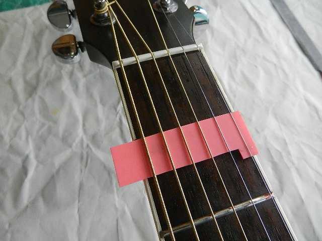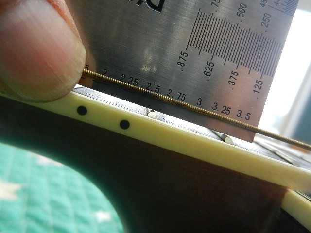 ●1フレットにスペーサーをセットしてリペア前の弦高を確認します