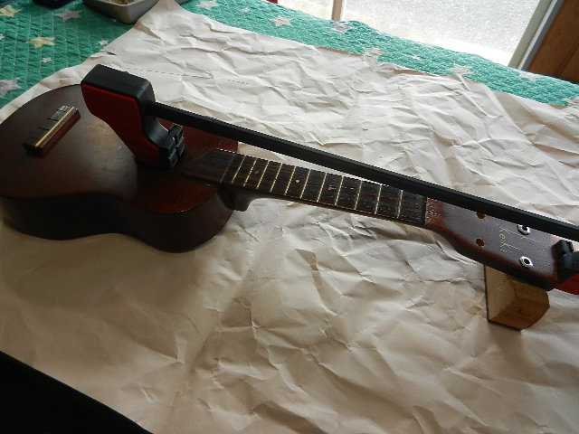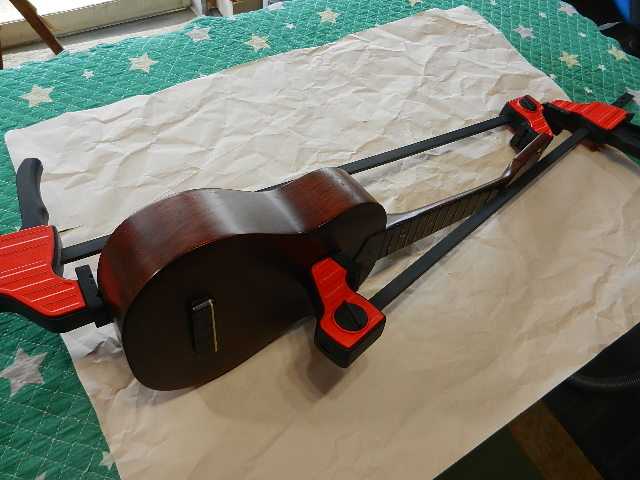 ●タイトボンドで正しいネック角度で固定出来るように、クランプで固定して接着を待ちます