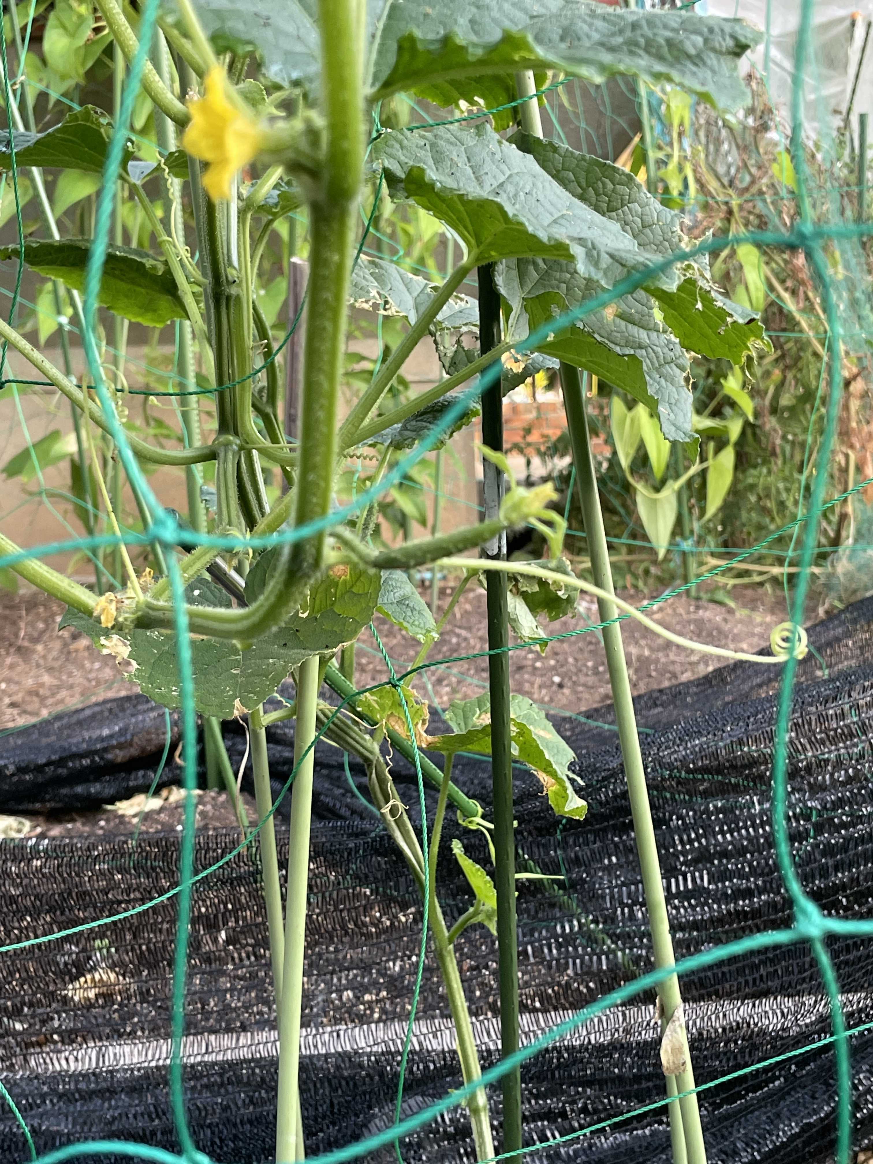 家庭菜園に水やり済ませきゅうりに必ず飛んで来て葉っぱを食べるウリハ虫を手で捕まえては潰しこの時期からのきゅうり栽培は初めてだからどんなかなと確認したら赤ちゃんきゅうりが10個程付いていた😊ゴーヤも生い茂るばかりで数個実が付いている程度だなと見回していたら足元に白い塊、なんとお化けゴーヤ葉っぱに隠れていたから見落としていた😅その分激しい日当たりも無いから傷んでいない😄