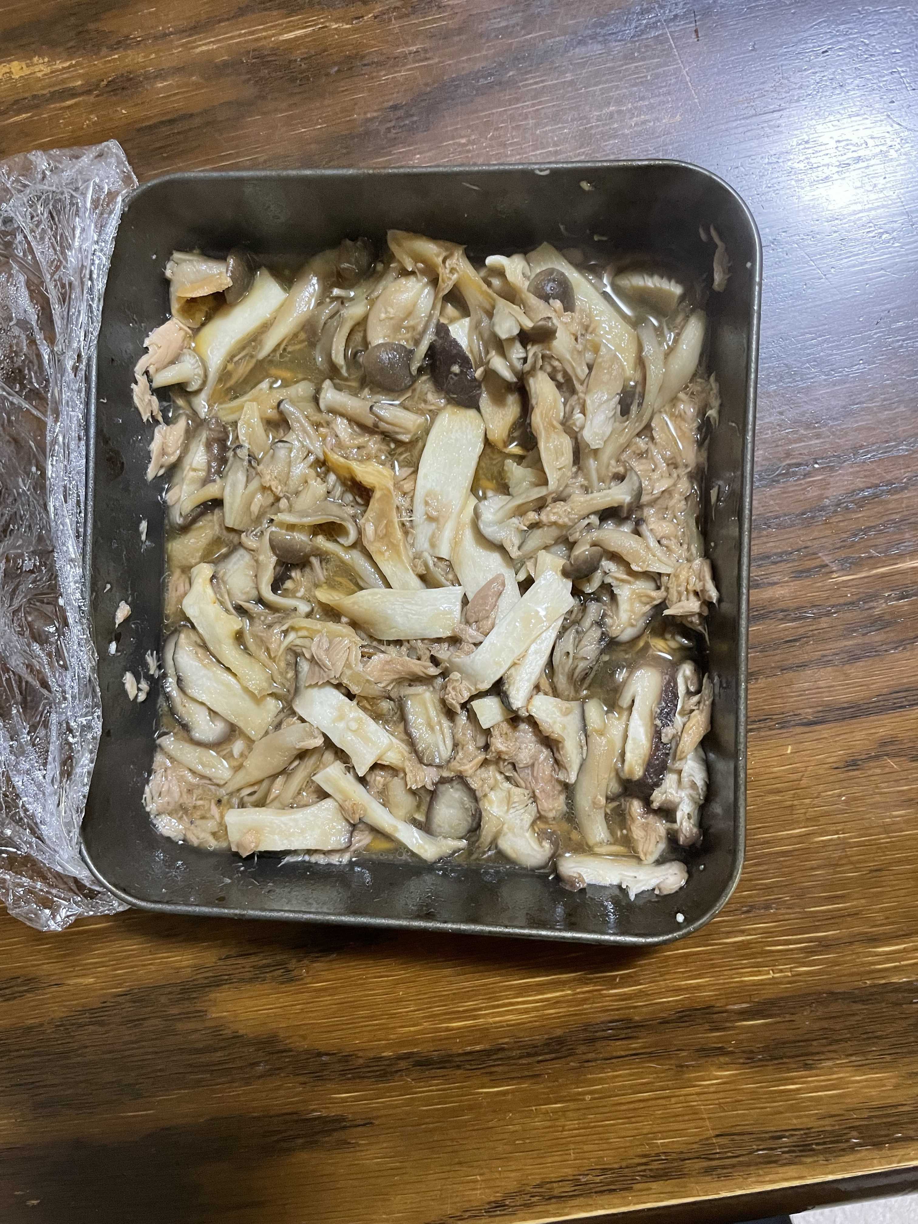 今夜は試合後に集計したりアップなどで晩酌のつまみ作る時間が無いので夕食後に簡単つまみを作る材料は前回使って残っていたキノコ類を適当な大きさに切ったり割いたりして耐熱皿にそこにシーチキン油漬けを入れてただし油は捨てる最後に出汁麺つゆでも良いが僕はお醤油を水で割り鶏がらスープとニンニク、ごま油少し全体にまわしかけてラップをふんわり600Wで2分弱一度取り出してよく混ぜたら再度600Wで2分半此れで出来上がり、好みで胡椒など10分も掛からずフライパンも使わないので後片付けも楽😄出来上がりを試食してみたが美味しい😊