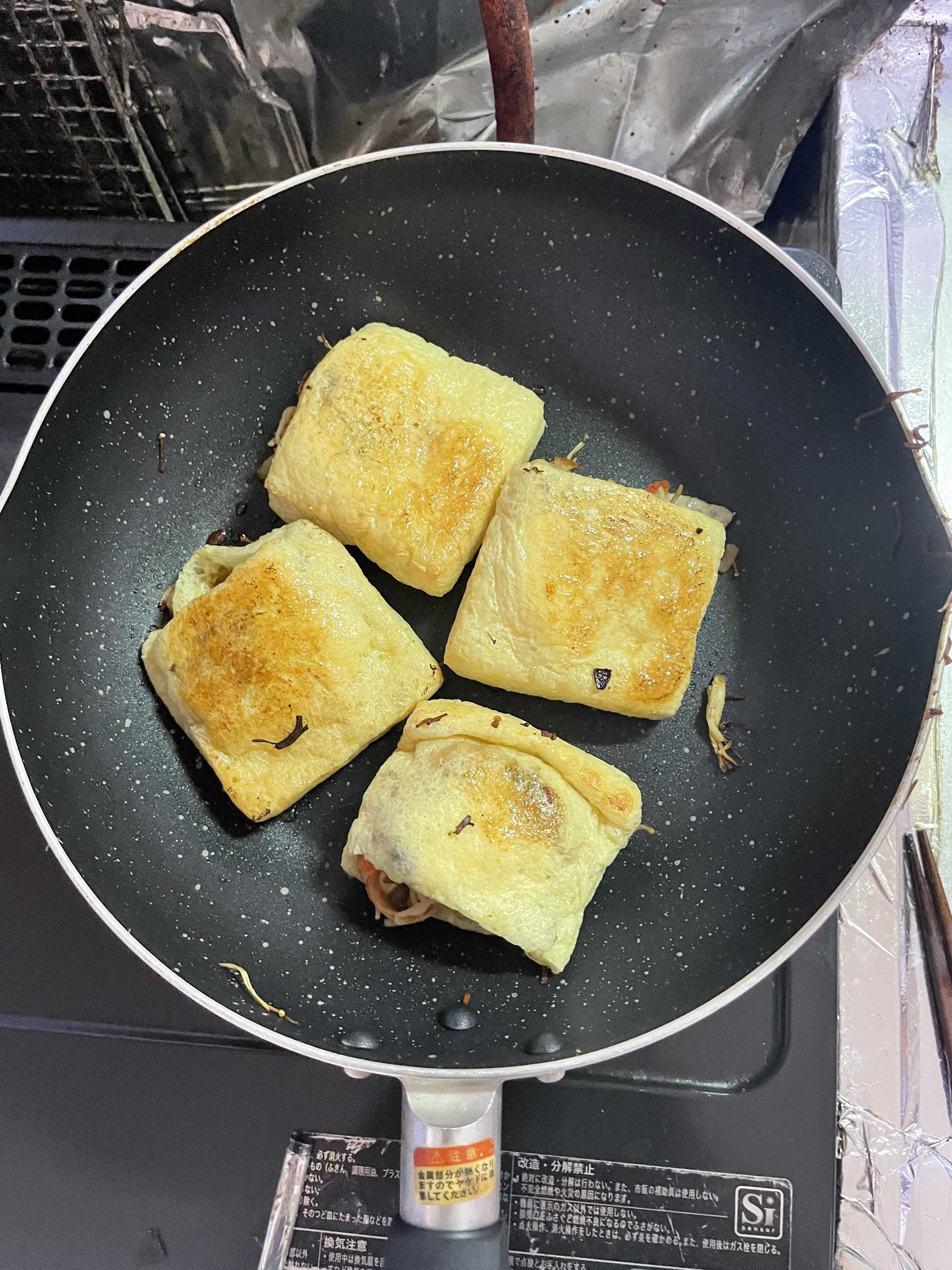 今夜のつまみは巾着一度しめじ、舞茸などを炒めお酒を少しそこにカニカマを小さく割いて鶏がらスープとお醤油で味付け一度取り出してピザ用チーズを混ぜ込み油揚げの中に詰め込み弱火で両面こんがり焼いたら出来上がり食べる時にお醤油かソースを掛けてマヨネーズ血糖値対策のおつまみでした😄