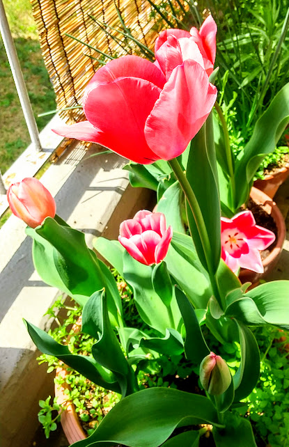 チューリップ が満開!です。下の写真は、同じ 植木鉢 の 三日前の姿 ですが、そこで 蕾 だったのも今日は 花 を開いています(笑)。暖かい日が続いていて、 チューリップ とかにはそれが楽しいんでしょうね(笑)。