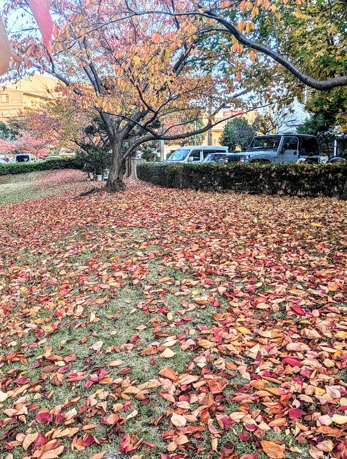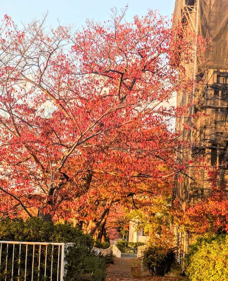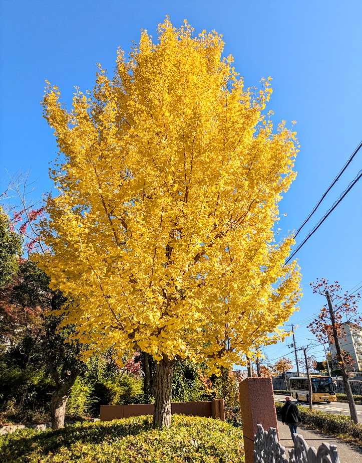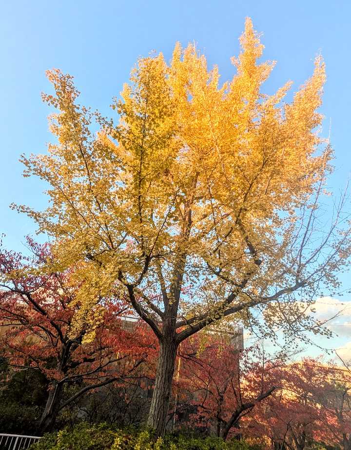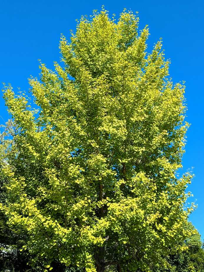 です。黄色くなって、散り始めています。秋の団地の、ボクの自慢です(笑)。二月前はこんな様子でした。
