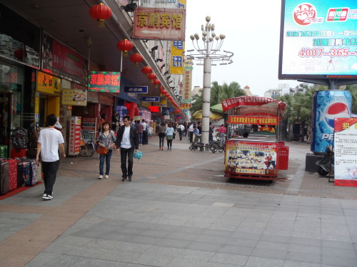 日曜日、東莞を探索しました近所の商店街、南城歩行街100軒以上の主に衣服屋が並んでいます。一番奥には真ん中にテーブルがあり両側に店がいっぱいの食堂。黒いシャツ(制服)を159元で買いました。1枚目を水曜日に299元で買ったらみんなに100元ぐらいだといわれて安いのに挑戦、たぶんみんなはこれを100元にねぎるのだろう。初めてバスに乗る。前乗り2元先払いのバス。2元以外の行き先を言わなければならないバスにはまだ乗れない。莞太路を北上、この道のバス停は区間距離が長い2駅乗って、香港から来た時降りたホテルの確認、もう帰る準備です市役所横のケーキ工場、日本だと高く土地が売れて再開発ですが、 歩いて北上、西側に文具市場がありました中国は同業者が集まって市場を作っているところが多いここも数十軒その先、東側には大きな職業斡旋会社が、遠くのピンクの建物から歩道橋まで並木に隠れているところも斡旋会社です。日曜日なのに人はまばら、やっぱり人手不足なのでしょうか?、残念なことにアパートのそばの小さな本屋で6元で買った地図が1元で露天で売られてましたここから無事にバスに乗り帰宅