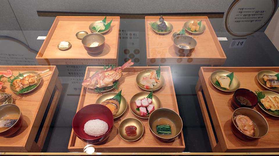 信長が家康をもてなした際の料理、室町将軍の御膳も紹介。大名の本膳料理、懐石料理が今の和食の原型になったのかと模型を見て理解。