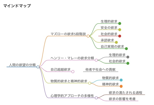 人間の心には「いつも3匹のタイが泳いでいる」というのです。「必要とされタイ、役に立ちタイ、認められタイ」のタイだそうです。いろいろなためになる言葉があるんですね。そもそも「タイ言葉」うちなる心からの発動であり希求、願望でもあるわけです。欲望は、本能として食欲・性欲・睡眠欲の3つ、付属して金銭欲、出世欲、名誉欲、 ーーーーーーーーーー人間の欲望の分類人間の欲望は多様ですが、代表的な心理学の理論に基づく分類法として「マズローの欲求5段階説」が広く知られています。この理論はアブラハム・マズローによって提唱され、物質的欲求と精神的欲求を階層的に構成しています。生理的欲求: 基本的な生存に必要な欲求で、食事、睡眠、呼吸、性欲などが含まれます。これは人間が持つ欲求の基盤です。安全の欲求: 身体的安全や安定した生活環境を求める欲求で、病気や自然災害、経済的不安からの保護などが該当します。この段階が満たされることにより、次の社会的欲求が発現します。社会的欲求: 人間関係や所属を求める欲求で、家族や友人との絆、コミュニティへの帰属などが含まれます。孤独感を和らげるための重要な要素として機能します。承認欲求: 他者に認められたいという欲求で、自尊心や評価が求められます。仕事での成果や、社会的地位の向上に関連しています。自己実現の欲求: 自分自身を最大限に表現し、自らの可能性を追求したいという欲求です。個人の夢や目標に向かって成長したいという欲求を指します。このように、マズローの欲求5段階説は人間の欲望を段階的に理解するための助けとなります。また、他の視点からも欲望を分類する方法があります。例えば、心理学者ヘンリー・マレーによる「生理的欲求」「社会的欲求」が理解しやすいと言われています。生理的欲求は生存に直結する基本的な欲求であり、社会的欲求は人間関係や集団における欲望を指します。さらに、物質的欲求と精神的欲求、または欠乏欲求と成長欲求という視点でも分類できます。これにより、個々の欲求がどのように形成され、満たされていくのかを理解する手助けとなります。人間の欲求には、マズローの欲求5段階説以外にも様々な分類方法があります。例えば、心理学者ヘンリー・マレーによる欲求の分類においては「生理的欲求」と「社会的欲求」が主要な要素として取り上げられます。生理的欲求は身体的生存に関連し、食事や睡眠、性欲を含み、社会的欲求は人間関係や所属を求めるものであり、友人や家族とのつながりを重視します。また、マズローの理論が進化した結果、自己実現欲求を超えた「自己超越欲求」が追加され、他者や社会に対する貢献を求める欲求として理解されています。加えて、物質的欲求と精神的欲求という観点からも分類され、前者は基本的な生理的欲求を含む一方、後者は自己実現などの高次な欲求に関連します。このように、心理学的なアプローチは多様であり、個々の欲求が満たされる過程やその影響についても考慮することが重要です。 ◆◆◆◆ ◆◆◆◆ ◆◆◆◆