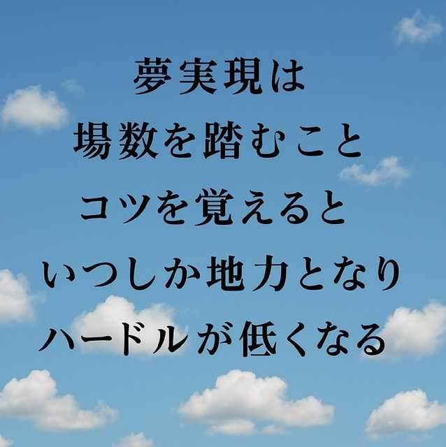「夢は必ず実現する」以前ならばこのような文言は書き込まなかった。と云うよりも書き込めなかった訳です躊躇したわけですが、その躊躇に霞がかかり無くなったような感覚。心境も変化をきたしたのでしょう。なんとなれば、そう思った方が楽しいし、夢もある。又、自分でも夢実現化への道筋を理解し始めて実体験も出始めたわけです。例えば人前で歌うカラオケなんてことは大の苦手で避けていたのが今年の正月の詩吟の新年会で130人の前でカラオケを歌ってしかも評判が良かったのです。10年前ならとても考えられなかったことです。シコ踏み連続100回もそうです。そのコツがあることがわかったのです。コツがわかれば、あとはコツコツとやり続けるだけ。コツコツとやり続けるからコツと云うわけです。正確にはコツコツですね。コツコツとやり続けてゆくと、内在する力が表に顕在し出てくるわけです。場慣れする事でその場が特別な場で無くなるわけです。場慣れすることで自信も生まれてくるわけです。人前で講演するなんてこと場慣れすればなんとかなるどころか、進んでやりたくなったりするわけです。原稿を書くなどと云う作業もそんなに気にならなくなるわけです。コツコツやり続けて場慣れすれば大抵のことは何とかなるのでは無いかと思えるようになったわけです。これを年の功と云うのでしょうか。そう云う中で「夢は必ず実現する」と思えた方が楽しいでしょう。楽しいことを実現できたら、それは楽しいに決まっているのではないでしょうか。そう思える自分になれたことがいいね。「内在する力が表に顕在し出てくる」ということを認識してコツコツ続ける事によってそうなる。場数を踏む事によって場慣れする。そうする事によって自信がつき、上手くいく好循環に入ってゆく。「すべての夢が必ず実現する」とまでいかなくとも、自分のかつての夢であったことが「夢は必ず実現する」と思えることは素晴らしいことじゃないですか。意識の変革はちょっとした差から始まる。ちょっとした差に気づき、そこから変革してゆく。 ◆◆◆◆◆◆◆◆◆◆◆◆◆◆◆◆
