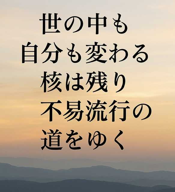 世の中の価値観も変化し、自分の価値観も年齢に伴い変化している。身体の細胞も3ヶ月〜半年で総変わりすると云われている、そこにいる自分は細胞を引き継がれた自分という存在であり、自分の魂がその根幹に宿る。考え方、価値観も変化の波に抵抗する訳にはいかないのだ。声であったり、言葉使いであったりがその人らしさを引きずっているから、その人と認識できる。変わる自分と変わらない自分。そこに不易流行と合い通ずるところがある。私たちの存在は、常に変化とともにあります。世の中の価値観が時代の流れに沿って変わるように、自分自身の価値観も年齢や経験を重ねることで変化します。若い頃に大切だと思っていたものが、今ではそれほど重きを置かなくなることもあります。逆に、当時は見えなかったものが今になって大きな意味を持つこともあります。興味深いのは、私たちの身体そのものが変化を体現しているという事実です。細胞は3ヶ月から半年でほぼ入れ替わるといわれ、かつての自分はすでに物質的には存在していない。それでも「自分」という感覚は続いています。なぜでしょうか。それは、細胞の変化を超えて、魂や意識といった根幹がそこに宿り続けるからかもしれません。しかし、その魂すら静止しているわけではなく、考え方や価値観は絶えず動き続けています。時代の変化の波に逆らえないように、私たちの内面も変化せざるを得ません。それでも、人はその変化の中に「自分らしさ」を見出します。それは声の響きや言葉遣いといった微細な特徴に現れ、他者はそこにあなたを認識します。変わる自分と変わらない自分。その交錯を表すのに「不易流行」という言葉があります。変わらない本質(不易)を抱えながらも、流れゆく時代に応じて姿を変える(流行)。自分軸とは、この二つが糾える縄のように絡まり合って、時間という一本の道をたどるものなのでしょう。変化を恐れず、しかし核を見失わない。それが、私たちが生きる上での知恵なのです。変わるのも 生きてる証と 風がいう ◆◆◆◆◆◆◆◆◆◆◆◆◆◆◆◆