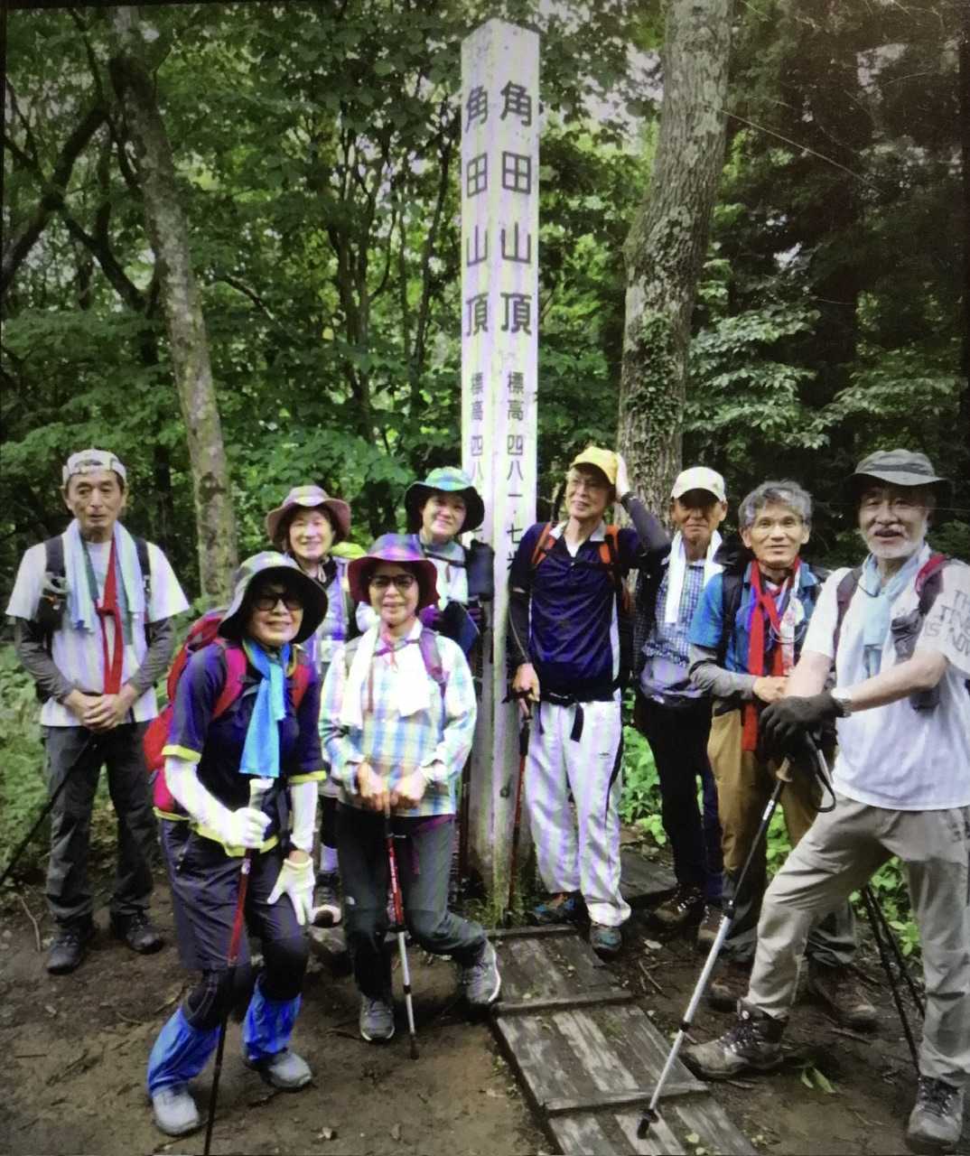 病み上がり直後の登山はバテバテでした、体調万全でないとダメですね。若くないことを実感です。過日、風邪が抜けきらない中、まぁこの位なら大丈夫だろうと登山に参加。以前にも登った事がある新潟県の角田山です。ところがどっこい今回は、登り始めて中頃から、雨が降り始めてカッパを着ても湿気で大変だろうと云う判断で、ずぶ濡れで山頂に到着。雨の中での食事タイム、OBの方々が山小屋でランチ。上がり込めば9名位何とかなりそうだ、濡れた身体をまず汗水を拭こう。雨の中、外ではとても考えられなかった。気がついてみたら班の9名のうち2人しか、中に入らなかったようだ。食べ終わって外に出たら雨が上がっていた。みんなの居るであろう観音広場に合流しましょうと、進んで行くのをついて行くと尾根道を下り始めたので、この先に広場はどう見ても無さそうだから引き返そうと戻って、頂上で皆が来るのを待った。班全員が揃ったところで記念撮影をしましょうと撮影してもらった。自分でもバテバテであった事がわかったので、果たしてどれ位、酷い状況に写って居るのか気になったので班長に写真をlineで送付してもらった。ひるがえって自分の姿を見た目で判断することもたまにはしてみないと思ったわけです。想定以上に疲れが見てとれる写真の立ち姿であった。帰り道、雨で滑り易くなっているので滑らないように転ばないように、細心の注意を払って一歩一歩下らなければと、その為には急がず、多少遅れても自分のペースで歩こうと、敢えてゆっくりと歩を進めることとした。おかげで1、2回滑りはしたが転んだり、尻餅は着かなかった。随分と多くの方が転んだり、尻餅を着いていたが、幸いなことにケガする人も無く下山できた。ただ懸念していた先頭と最後尾が離れてしまう歩き方だったので、我が班の後ろの人達は違うルートで下山してしまった。分岐点で誤って違う方に、元来た道から外れてしまったのだ。幸い下山した終着点が遠くない場所だったので、大きなロスにはならなかった。それでも雨により登山道の状況変化等で予定より1時間以上も費やした。天候が変わると山の顔は様変わりするのだ。