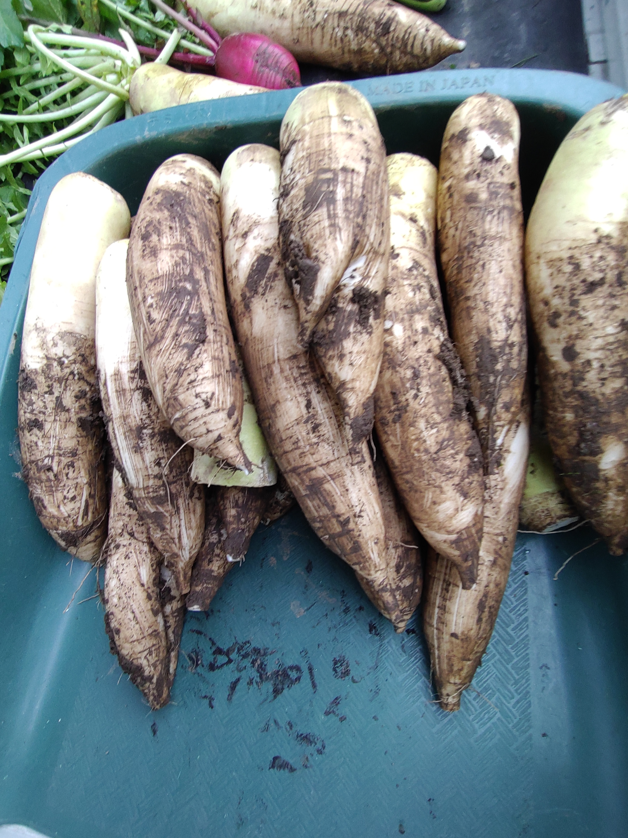 秋晴れの日曜日大根タクワン用に10kg収穫して洗いタクワンの下漬けしました紅くるり(赤大根)も初収穫甘酢づけにしたら綺麗な赤色になり美味しく仕上がりました紅くるりと言う品種初めて種を蒔き収穫しました生大根は凄く辛かったけど甘酢に漬けたら甘く美味しく食べられた