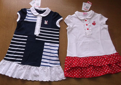 お披露目がすっかり遅くなってしまいましたが、ハロ赤の半額セールで友達に買って来てもらったお洋服たちです!スーリー5点にミキハウス1点とホットビスケッツ1点。どれも、狙っていたお洋服ばかりです!特にこのワンピース!・総柄刺繍ワンピース(ブルー80)ネットではレッドはどこも完売で、お店でもこのブルーの80がラス1だったとのことでした。私はどちらの色でも良かったので、まさか半額で手に入るなんて嬉しいです寝ているので膝上になっていますが、実際はもっと長めで、身幅にも余裕があるので、来年も着れそうですそれからミルキースーツ4点!・お花柄ミルキースーツ(ピンク90)・小花柄ミルキースーツ(ピンク90)・カッププリントミルキースーツ(ピンク90)・ローズプリントミルキースーツ(ピンク90)このミルキースーツ、買われている方をあまり見ませんでしたが、子供服の赤ちゃんやさんで発売開始されてから、ずーっと買い物カゴに入れていました。いつも花子のことをコブタちゃんとかゴリ子ちゃんなどと言って小馬鹿にする旦那が「花子がお人形さんみたいだ~」と言うほど好評でしたこのミルキースーツはあちこちで販売されていましたが、セール前にほとんど完売に……。一番狙いのピンク90を半額でGETできて嬉しい限りですこちらはノーチェックでした!友達が送ってきてくれた写メで一目惚れ。パフスリーブと裾フリルがたまらなく可愛いですカップ柄ミルキー。ネットでは取り扱っているお店が、ボンボンママンさんくらいしか見つからないのですが、一目見た時から狙っていました!写真で裾足しに履いているのは、クーラクールの盛夏物キュロットですが、スーリーのペチコートの方がしっくりときました。とにかく全部可愛いです!(服が)こんな可愛いお洋服をたくさん買って来てくれた友達に大感謝ー!秋冬新作ミルキースーツはこの2つを狙っております。セールを待っていたらサイズアウトするので定価購入予定です。(そのぶん枚数をしぼります……!)長くなったので、ミキハウスのお洋服は別の記事で紹介しまーす