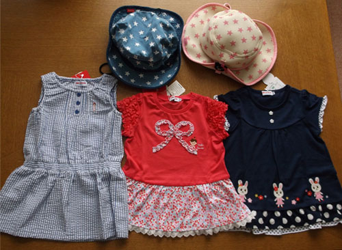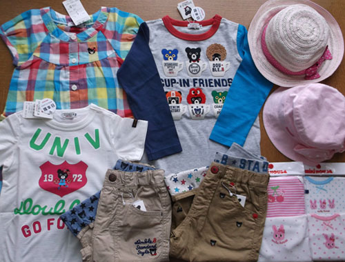 ハロ赤さんの半額セールが始まったので、急いでアップします。6月27日にスタートした、ミキハウスとダブルBのサマーセールの戦利品です……って、ごめんなさい。一緒に写しちゃいましたが、コチラは送料の関係で同梱した、定価のお品ですミキハウス公式オンラインさんでのお買い物・ダブルB CUP-IN FRIENDS♪長袖Tシャツ(マルチ110)・ミキハウス うさこタンクトップ肌着(90)・ミキハウス うさこキャミソール肌着(90)ロンTは、一目惚れした秋物新作です!定価で買うつもりなら、一刻も早く手に入れた方がお得だと考え、別に送料関係ないのに同梱しました北海道は、7月8月でも長袖着るくらい涼しい日がたま~にあるので、良しです肌着は本当に送料対策。って、うさことリーナちゃんのキャミ肌着を買ったつもりだったのに、何故かうさこのタンクトップタイプをポチっていました直前で思うところあって変更したのか、単なるうっかり間違いなのか、考えても考えても思い出せず、わたし(脳味噌)大丈夫!?と少々心配ですママプレ・キッズさんで購入した、20%OFFの帽子・ミキハウス リボン風日よけカバー付ハット(ピンクM50-52)・ミキハウス 綿レースサマーハット(白×ピンク52)(12-9106-847)ミキハウスの夏用の帽子が、気づけば、うさことカジュアルなものしかなかったので、20%OFFに喜んで飛びつきました。どちらも可愛くて、来年もかぶれそうなゆったりフィットで満足なのですが、今だと、ninnanannaさんで、30%OFFで販売されています702円の損失……しかもピンクもある……そして、主役の新作30%OFFのお洋服たち・ダブルB ふんわり軽やかワンピース(マルチ100)・ダブルB カレッジロゴ半袖Tシャツ(白100)(62-5209-954)・ダブルB プチベア刺繍7分丈パンツ(ベージュ130)(62-3204-564)・ダブルB 裾折り返し★SUMMER7分丈ジーンズ(ベージュ120)カレッジロゴTとプチベアパンツがe-子供服 ノンさん、ふんわりワンピースがミキハウス公式オンラインさん、SUMMER7分丈ジーンズがMAマーケット(RICKY TOWN)さんです。昨年30%OFFで先買いしたお品が、今年のシーズン初めにザクザクとアウトレットで登場して軽く遠い目になったので、今年はすぐに着られるサイズだけ厳選購入しました。買ってから気づいたのですが、B子ちゃんのワンピースが、2013年春物のミキハウスの長袖シャツと、生地がまったくおんなじでした!シャツは、2014年の新春3万円福袋(ミキハウス男の子120)に入っていたものです。期せずして、可愛いお揃いをGETでき大満足です30%OFFセールでの購入は、次回アップの「その2」でおしまいにします。あとは40~50%OFF待ちです!