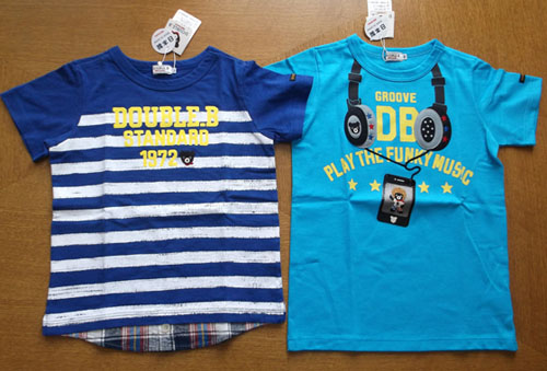 7月18日の、e-子供服 ノンさんのポッキリセールでの戦利品です・ダブルB 手書き風ボーダー☆半袖Tシャツ(青120) 9072円 → 5000円(45%OFF)(62-5205-952)・ダブルB スマホヘッドフォン♪半袖Tシャツ(青130) 9828円 → 5000円(49%OFF)(62-5206-955)厳選して、値引率の高いものだけ選びました5000円ポッキリでは、手描き風ボーダーワンピース(120・130)と、ダブルBの消防車T(100・110)が一番値引率が高く、50%OFF以下だったのですが、ワンピはサイズが大きすぎ、消防車は好みすぎてすでにプロパー購入済みだったという……まあ、どちらにしても、瞬殺で買えなかったと思いますが(笑)……そして、お揃いの出来るお洋服を手に入れてしまったら、片割れも欲しくなってしまうのがお揃いハンターのサガ。今朝の、子供服ジョリィ楽天市場店さんのKP半額セール時に、どさくさにまぎれて購入しちゃいましたボーダーワンピース100とスマホTのピンク110。スマホTは太郎が今すぐ着られるので良いのですが、ワンピは来年用。最近のミキハウス、セール落ちした商品、さらにはしなかった商品まで、すぐに30~50%OFFでアウトレットに登場するので、来年用を30%OFFぽっちで買いたくはなかったのですが、お揃いコーデのために苦渋の選択をしましたe-子供服 ノンさんでは、他にスポーツブランドの1000円ポッキリの半袖Tシャツを同梱しましたアディダスだけ130で、あとの3枚は140です。1枚は、送料無料対策でダブルBと一緒にポチったのですが、残りの3枚はあとから追加で同梱してもらいました。……1枚だけでやめておけばよかったですや、いえ、お品に文句はないのです。生地も縫製もしっかりしていました。ただ、140サイズ……広げると、デカイ 場所とる価格も1900円(+税)が1000円ポッキリなので、割引率は半額程度。なので、別に数年先買いサイズを、いま無理に買わなくても良かったです~