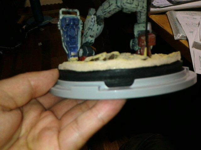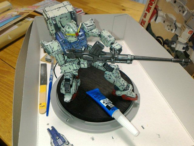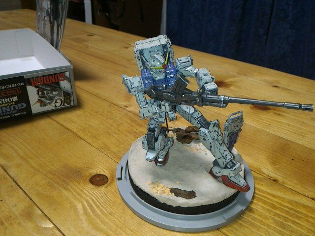 とうとう40回です(^_^;)長いな〜〜〜〜〜仕方ないね。時間がなさすぎます(^_^;)さて 陸戦型ですが今日は材料があるので早速ベースにとりかかります!まずはベースに足の位置などをマーキング。関節部を ある程度瞬着で固めてポーズが変わらないようにしておきます。で一旦 ガンダムには退場してもらいベースにマスキングテープを巻きました。う〜〜〜んよく考えると ジオラマ作るのははじめてなんでよくわかっておりません(^_^;)たぶん ここに粘土を敷いていくんだよね?まあ勉強ですよ。とりあえず 木粉粘土を敷き詰めました。あれ?これって 粘土の下に木工ボンドを塗らないと剥がれてしまうんじゃ・・・・・まあいいかこれも勉強ですよ(^_^;)とりあえず進めないとね〜〜〜〜とりあえず キャノンを撃った直後のつもりなんで砂漠地帯で 足が踏ん張りが効かずに後ろへ下がっているような感じに 粘土を整形してみました。こんなもんかね〜〜〜〜〜なかなか完成図が 想像できない(^_^;)まあいいか。とりあえず進めよう。ここからさらに 園芸用の木のチップを載せて岩っぽく。そして 小石はゼオライトを若干撒いてみました。これらを 木工用ボンドを水で溶いた液で固めてやります。とりあえずこれで良い。あとは乾燥してから塗装していこう。さあ ここから一気に行くよ〜〜〜〜〜にほんブログ村 家族ブログにほんブログ村 家庭・家族にほんブログ村 ハンドメイドブログにほんブログ村 木工にほんブログ村 車 修理・整備にほんブログ村 自作PCにほんブログ村