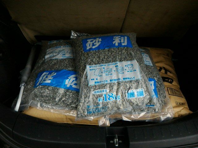 さて御札のついでにナフコへ。先日 生コンが無くなったんで買わないと作業できません(^_^;)ということで買ってきました〜〜〜〜生コン50キロ、小砂利60キロです。生コンをもっと買わないといけませんが最近 雨続きなんでとりあえずで。今日は 前回の続き。壁作りの続きです。前回中途半端に固めていましたので端までブロックを積んで仕切りを作って 小砂利を敷き詰めました。これに水っぽいコンクリを流しこんで砂利ごと固めて基礎にします。いや〜〜〜〜混ぜる道具を夏場に作りましたがほんとに手間がなくなりましたよ(*^_^*)5分で25キロ (一袋分)混ぜれます。25キロまきましたが まだ足りないみたい・・・・でもいいか。小雨も降っているので あまり状況はよろしくない。次回 きっちり流しこむようにしましょうかね。にほんブログ村 家族ブログにほんブログ村 家庭・家族にほんブログ村 ハンドメイドブログにほんブログ村 木工にほんブログ村 車 修理・整備にほんブログ村 自作PCにほんブログ村