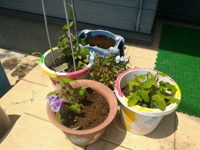 子供らの植木鉢です。朝顔が咲き始めたので棒を立てることにしました。適当に 畑に転がっている棒をナイロンバンドで固定。こんな感じです。で空いている植木鉢がひとつあるので緑の少年団でもらった花を移植しました。これで全部うまった。だんだん植木鉢も増えますね。にほんブログ村 家族ブログにほんブログ村 家庭・家族にほんブログ村 ハンドメイドブログにほんブログ村 木工にほんブログ村 車 修理・整備にほんブログ村 自作PCにほんブログ村