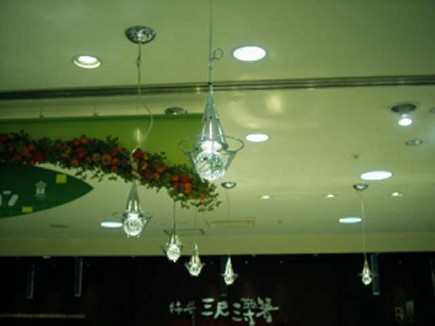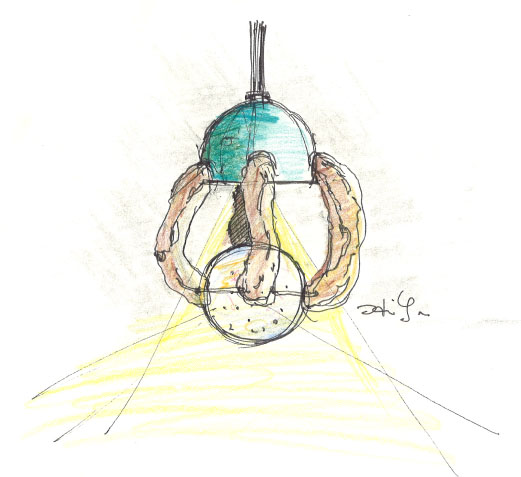 このランプ、器具の下に大きなガラス球があります。 ランプの下にさらに、ガラス球をつけ、違ったイメージを出した。照明です。 このアイディア、使えると思いません。 1、ランプ照らすもの。 2、照らされるものがランプの機能を阻害せず新しいイメージを作る。 複合の面白さです。