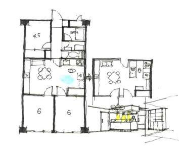 さてマンションです。60平方メートルの標準的マンション間取りです。部屋は矩形で構成されます。水周り、トイレ、バス、キッチンは集中します。見て解るとおり、家の表情を作れるのはキッチンです。左のプランは、売り出すときのプランです。広さを強調しますが、水色の部分はとても使いづらい空間です。キッチンをII型にすると部屋に表情が出てきます。背を向けた、主婦?が食べる人のほうを向き、調理をし、食事に笑顔が生まれます。10のありがとう1、朝目覚めてありがとう2、新しい一日ありがとう3、電車、横浜からすわれてありがとう4、奈々ちゃん無邪気な笑顔ありがとう5、絵がかけてありがとう6、絵をもうすこしうまくなろうと思えてありがとう7、くだらない出会いサイトのアルバイトのお兄さんありがとう8、中国語、あの発音ありがとう9、家が語ぶちでありがとう10、ありがとうと、いえてありがとう
