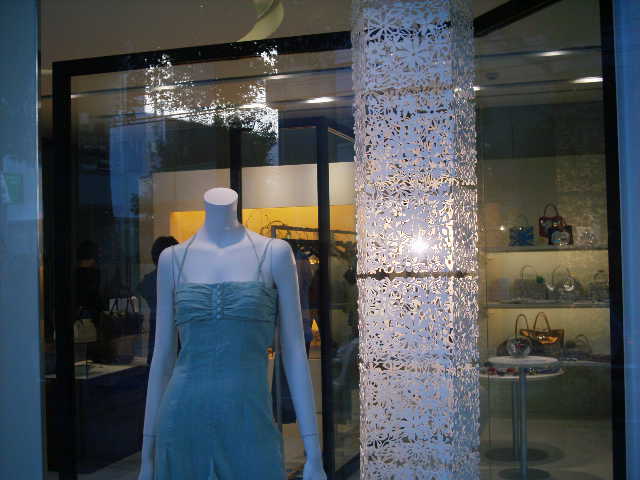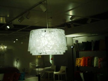 南青山のブティックで見つけたディスプレイ小物です。プラスチックのいたを切り抜き、リングでつなぎ、中に照明を施しています。シャンデリアのような効果ですが、木で作ったらもっと美しいかも。