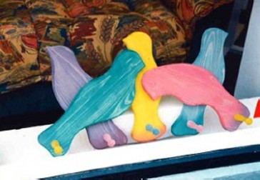 これもコペンで見つけました。鳥の形で木を切り抜き、ひっくり返したりしながら染色、かわいいハンガー掛けです。