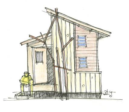 アラバマの建築学科の学生の作った家です。いたるところに、タイヤ、車の窓、建築廃材が使われています。