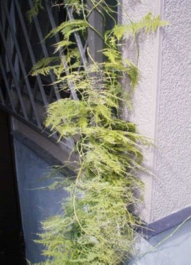 町で見つけた不思議な植物。全部写しきれていないのですが、この植物葉はシダのようですがどんどん2メートルほど伸びて、つたのように蔓を伸ばしています。名前、存知の方教えてください。