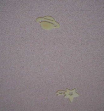 これは娘が、12才までで育った部屋の天井です。 張り付いているのは、土星と彗星の蓄光プラスッチクの星です。 おそらく、ロスのユニバーサルスタジオのショッピングモールのブラックライト、夜行製品の店で買ったものだったと思います。 それをある日、娘が見つけ天井に張りました。 このプラスチックは昼の明かりを蓄え、よる電気が消えると一時的に光ります。天井に薄ぼんやり星が現れます。 娘が寝るとき、夢に入るとき見た、星空です。