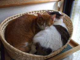 食後のお昼寝は、窓辺でだいくんとみおちゃん、みおちゃんは最近だい君がお気に入り、シュウくんのポジションでハート形をつくってねてます。そこへ忍び寄る黒いかげ。しゅうくん、しばらくじと~っとした目で二匹をながめ・・・「せんぱいとは一緒に寝られないしな。」とお隣のごうくんのかごをのりこえ・・・ひとりさびしく眠ることに(';')今日は着物でおでかけ。中華街で写真のかごを一つ買いました。ケンカにならないようにしたいといろんなところに籠をおいて、うちはかごだらけ~です。それから、今回も2000円代の食べ放題に。平日は土日より300円ほど安いところが多いです。今回のお店もとてもよかった。割合と、点心ばかりが食べ放題になっているところが多いのですが、一品料理(チェーシューやクラゲ、野菜いため、北京ダック、海老チリなどなど)がオーダーできて、お味がしっかりしていたので、いつもよりちょっぴり得した気分です。おみやげに大根もちや、せいろなどかいました。また写真が撮ったらご紹介します。