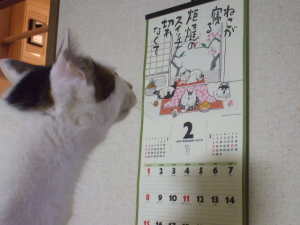 あっという間に2月、休みという休みがなくなって昨年の秋から、とうとう、休めると思うと、なんだか気が抜けてしまうきょうこのごろ、先月に引き続きカレンダーを。今月はだいくんがながめてます。猫さん4匹、かわいいなあ。我が家みたいだわ(こたつないけど)