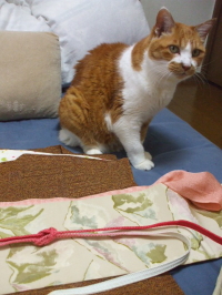 むぎさん、お着物をひろげてあそんでいると、かならずやってきます。なぜだろう?帯締めでじゃれたいのか、はたまた前の飼い主が着物をきていたか・・・。年をとってからうちにきたむぎこさん、ナゾが多いです。先日のくみあわせ、ちゃきちゃきっと元気なかんじ。こうすると、すこしはんなり・・・。半襟は先日購入したこんぺいとうのてぬぐい。並べて眺めるのはたのしく、心が潤います。
