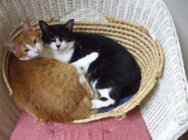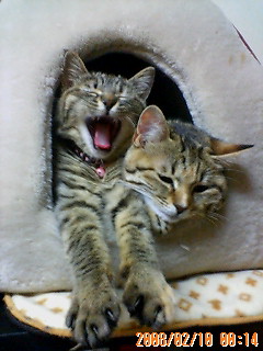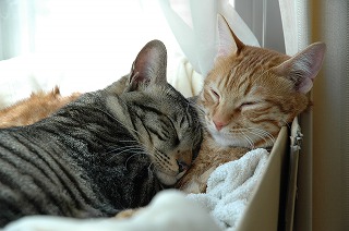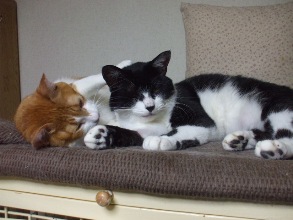 今日は午前中ひどい雨で仕事にいくのにも長靴があると便利だなあ、とふと思いましたよ。帰宅して、家の犬猫のお世話、地域猫のお世話にいき、自分の食事をつくって、そして、里親さんの募集の記事に書き込んだりしています。さて、二匹飼いのおすすめは以前もしましたが、先住猫さんが割合若い場合にはこのように、ほどなく仲のよい光景がみられます。右の子は、里子に出たチャコちゃんの里親さんのおたよりです。猫への愛情が強い方は、やはり二匹でなごんでいる姿をみるとご自分の心もなごむようですよ。私の経験ですと、ご年配の猫さんで一人でいた子は、なれるのに時間がかかります。しかし、若い子はお互い遊び相手としてグルーミングの相手として、ほどなく仲良くなることがほとんどです。トライアルの時期に先住猫さんとの相性が悪そうなあ場合にも万が一難しい場合もご相談していただければ飼い主さんと、猫たちのために御戻しいただくということもできますので。今いる猫のお友達をつくりたいという方も・・・・ぜひご相談くださいね。その場合・・・同居猫は異性の方が相性がよいみたいですよ我が家の子たちは、必然的に!?すでに気合いの入った先輩猫がかまえていますので、周りとの協調ができていると思います。左はすこし先輩のミオちゃん右は一番新入りのカブくん神奈川より・・・・・ミオちゃん里親さん募集中カブくん里親さん募集中そして、ランキングの状況は・・・・現在21位だそうです。ありがとうございます!こちらのリンクを、クリックしてネにほんブログ村