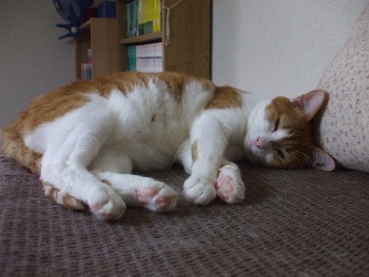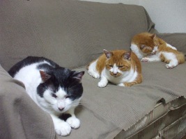 夜、ベッドで本をよみはじめたり、「もう寝ましょう!」と声をかけてリビングの電気がきえると、のっそのっそと、おもむろにここに集まってきます。だいたいいつもこのメンバーこの二匹は右のチャオくんの毛をひっぱるいたずらをしないので安心して、寝られるんです。夜中ふとみると、仰向けにながーくなってねているときもあるのです。寝ているとスーピースーピーと小さな寝息が聞こえてきます。明け方になると、もうみんないないんですよ。窓際などでくつろいでいます。年よりは早寝早起きですね。シニア猫さん、里親さん募集ずっと掲載していますが、むずかしいみたい。現在、このサイトからは、若猫の、ミオちゃんとぼちぼち、カブくんの里親さん募集を掲載しています。