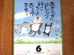 はやいものでもう、6月薫風がここちよい時期になりましたが、いろいろなところで草刈りをしていてイネ科の雑草などで、この時期アレルギーに悩まされます(';')さて、6月のカレンダーを掲載しわすれていました。空が、真っ青できもちよさそう~最近、真っ青な空をみなくなったきがします。なぜかすこしよどんでいるというか・・・いつも。あせらず、あるがままのミオちゃんです。でも、だれか他の子をかわいがっていると、どんなに寝ぼけていても「わたしもにゃあ」とやってくるときはあせっている気がします。そして、こちらは、マイペースナンバー1のむぎこさん。かわいいですね夫作、おやつ。おわり