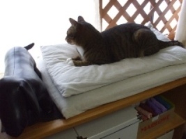 こんにちは、だんだん、あつくなってきて窓をあけたい季節がやってきましたね。動物たちは窓辺が好きでが、網戸は、重みでもはずれてしまうので以前、ラティスをとりつけてみたんですよ。あまり閉鎖的でなくて、お部屋のポイントになっています。マットは、二枚重ねておいておいたら気に入ったようでよくここにいるようになったので、そのままにしています。くちゃくちゃタオルは見向きもしないのに、シャツやタオルをたたんでいるとその上にのってきたりするのがおもしろいですちなみに、下の棚には、着物の小物収納など・・・しているんです。カブくん里親さん募集中ランキング参加中ぽちっとしてネにほんブログ村