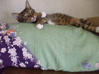 おはようございます久しぶりに晴れて洗濯ができますね。今日の猫たち・・・最近、ゆかたを出して積み上げてあるのでその上に寝るようになってしまった、シュウくんおろそうとしても降りません。夜もこっそりここにきています。絹の風呂敷の上なのでさらさらして気持ち良いのでしょうか?ちなみに・・・浴衣は結構ありますが、新古で800円なんてのもありますよ。こちらのいただきものの風呂敷ですが、とても気に入っているんです。緑とむらさきの配色が日本ならではですね。ちなみに、このサイトのホームの花はむらさきで、配色はグリーンをいれているんですよ■神奈川から里親さん募集中■★神奈川県藤沢市当サイトから、写真の黒白むっちりカブくん里親さん募集中ランキング参加中
