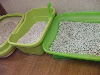 こんばんは、突然ですが猫トイレです。たくさんいますので並べています。他にもたくさんありますが、ここは、いつの間にかグリーンで統一されています。真ん中の小さめのトイレは、小さいので、ゲージにいれて活用していますよ。一番右は、デオトイレといって砂の下はネットになっていて下のトレーにセットしたシートにおしっこが落ちてたまるしくみになっていますよこれは手入れが簡単ですし、猫砂自体がよごれないので清潔でよいのですが、やはり細かい砂のタイプの方が猫たちには人気があります。用を足したあと、砂でかきかきするのも猫の欲求をしれませんね。最近トイレのほそいふちに器用に両足をのっけて用を足す子もいるのですが、おしりがトイレではなく外に向いてしまっていて外側にしているシニアがいて、ぼけっちゃったかなあとシンパイしましたが、そのときだけでおそらく、ぼーっとしていたんでしょうねえ。今日は台所の食器棚に冒険のカブくん耳が下がっているのがわかりますか??このように耳が下がっているのは警戒しているサインですね。わたしが突然顔をだしたからびっくりしちゃったのね。神奈川より里親さん募集中・・・・・カブくん、まだこのサイトからは募集を続けます。そして、情報として、知人が神奈川にて、3か月前後の子猫たちの募集もしていますよ。自宅前の倉庫で生まれていたのを発見し母親とともに早期に保護して育てたのでとても健康な良い状態だそうですよ。詳しい情報をおしりになりたい方は下記の募集要項より、お問い合わせくださいませ。カブくん里親さん募集中そして、募集が猫好きの方の目にとまりますように。ランキングにほんブログ村